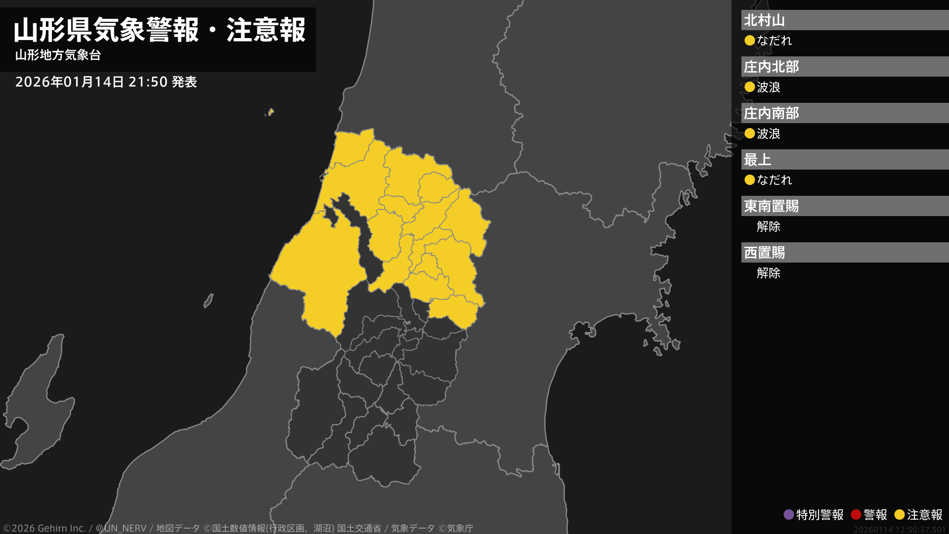 【山形県 気象警報・注意報 2026年01月14日 21:50】庄内では、高波に注意してください。村山、最上では、なだれに注意してください。#気象警報注意報 #山形県