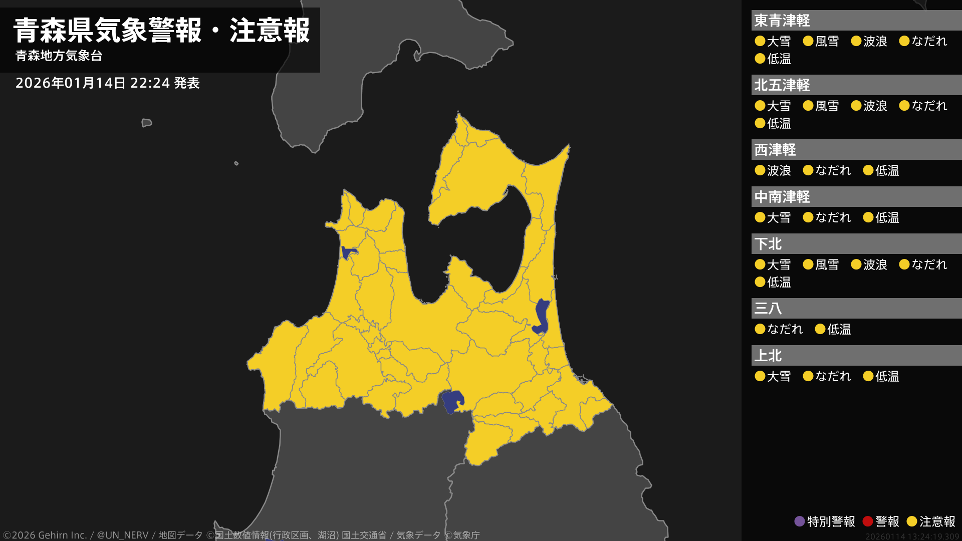 【青森県 気象警報・注意報 2026年01月14日 22:24】津軽、下北では、風雪や高波に注意してください。青森県では、大雪やなだれ、低温に注意してください。#気象警報注意報 #青森県
