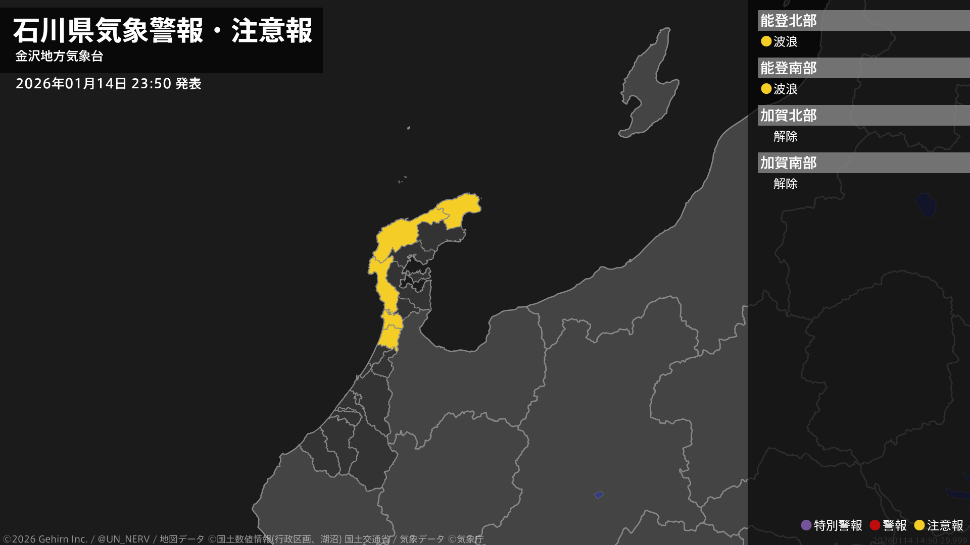 【石川県 気象警報・注意報 2026年01月14日 23:50】能登では、高波に注意してください。#気象警報注意報 #石川県