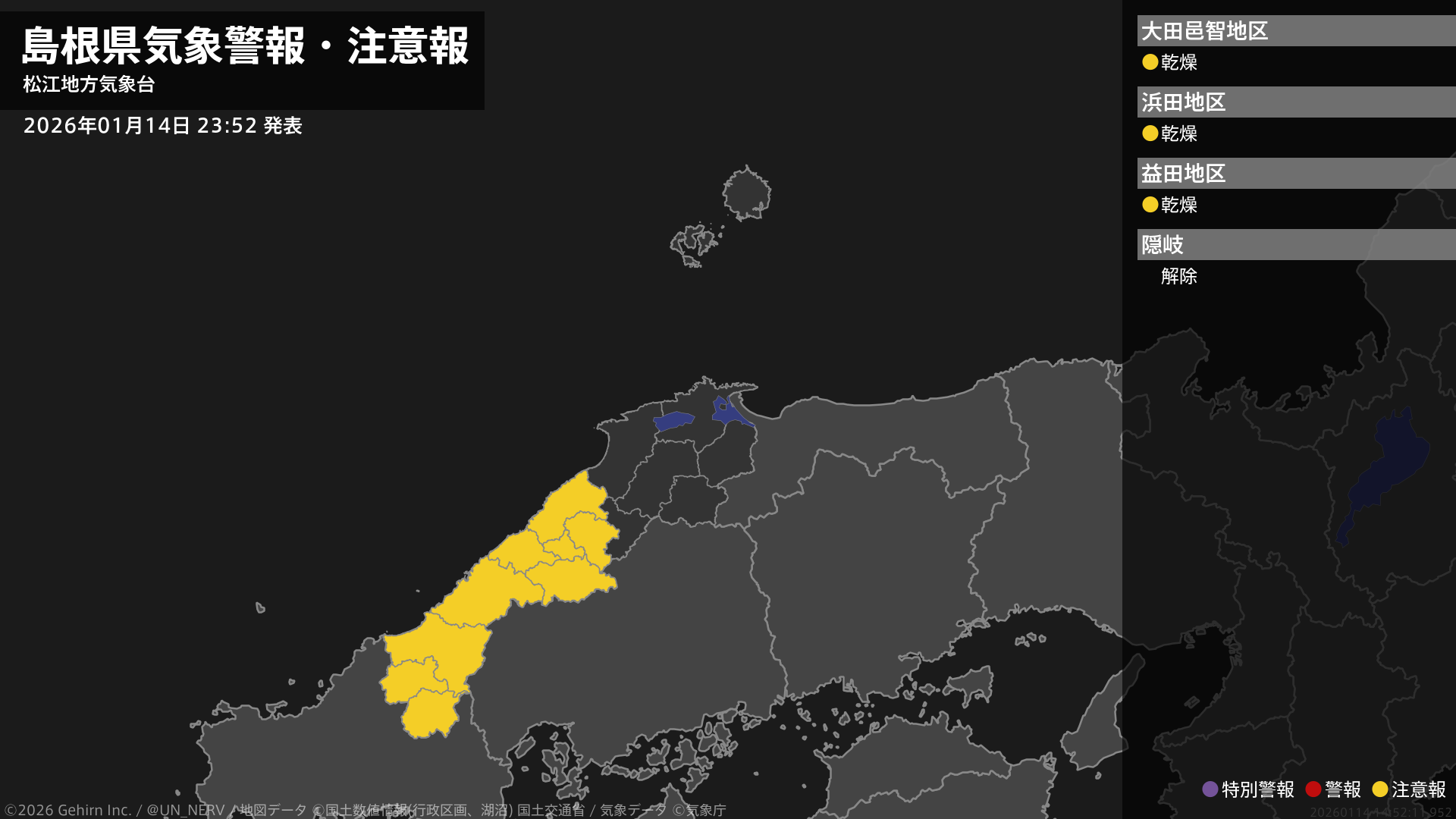【島根県 気象警報・注意報 2026年01月14日 23:52】西部では、15日まで空気の乾燥した状態が続くため、火の取り扱いに注意してください。#気象警報注意報 #島根県