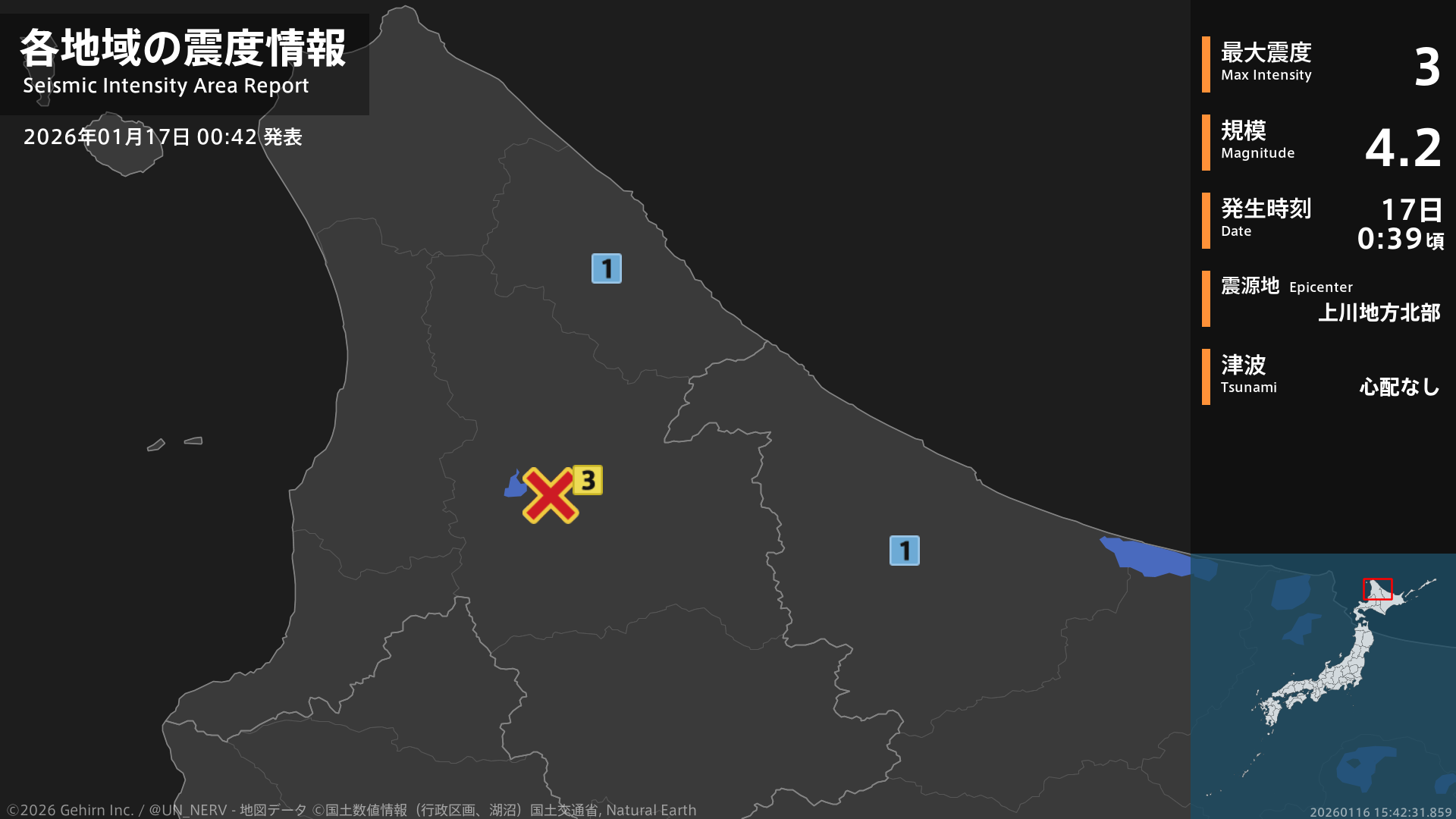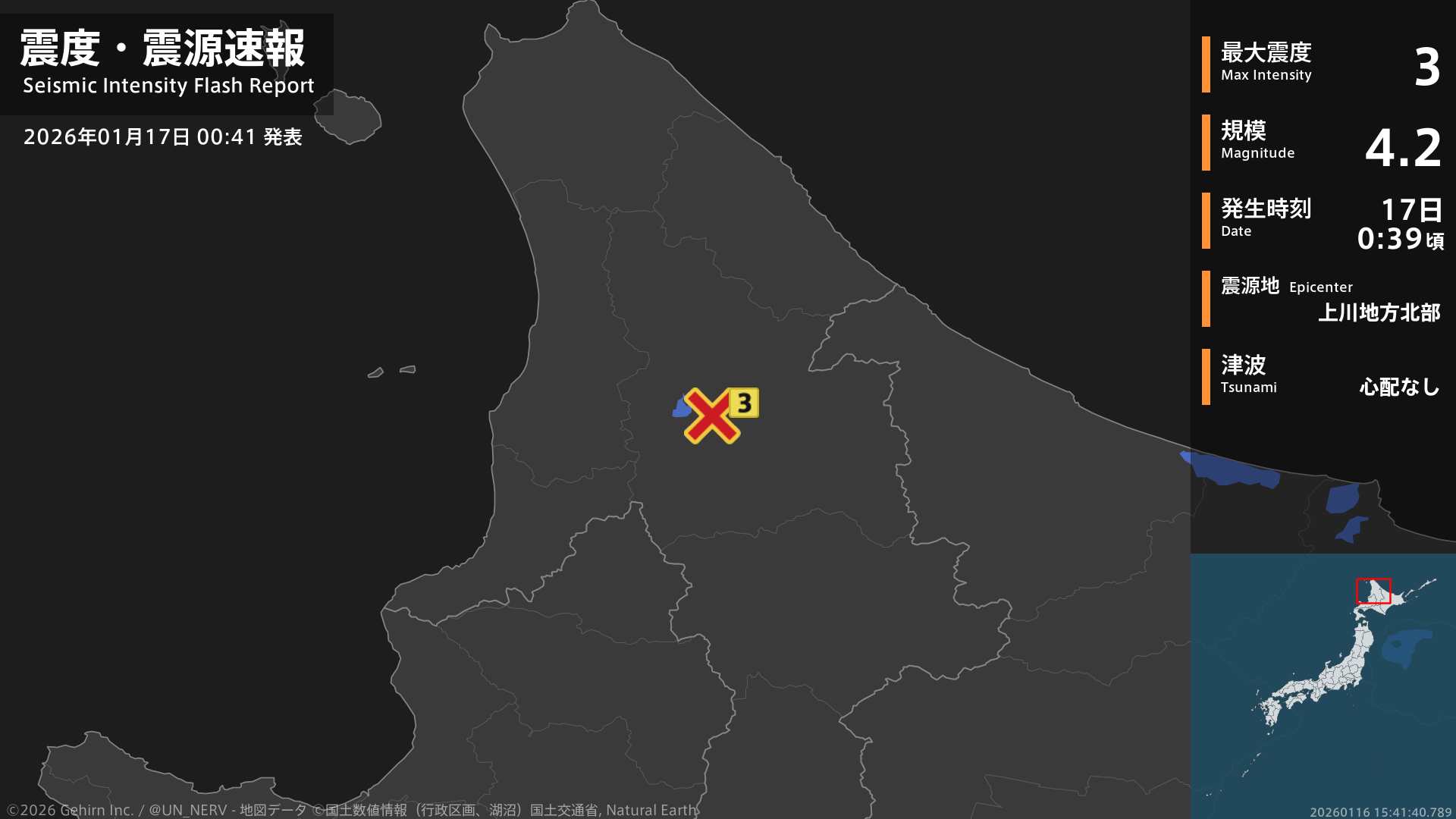 0時39分頃、上川地方北部を震源とする地震がありました。地震の規模はM4.0程度、最大震度3程度と推定されています。この情報は気象庁の予報に基づく推定です。情報は誤差を含む場合があります。