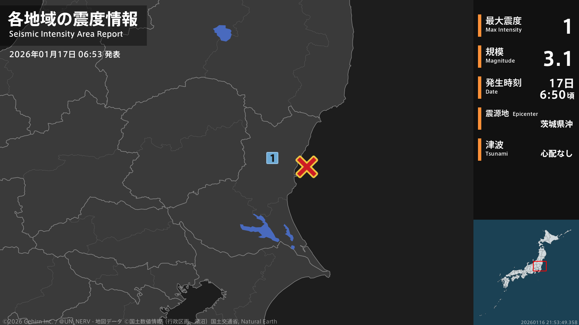 【地震情報 2026年1月17日】6時50分頃、茨城県沖を震源とする地震がありました。震源の深さは約60km、地震の規模はM3.1、最大震度1を茨城県で観測しています。この地震による津波の心配はありません。#地震 #茨城県