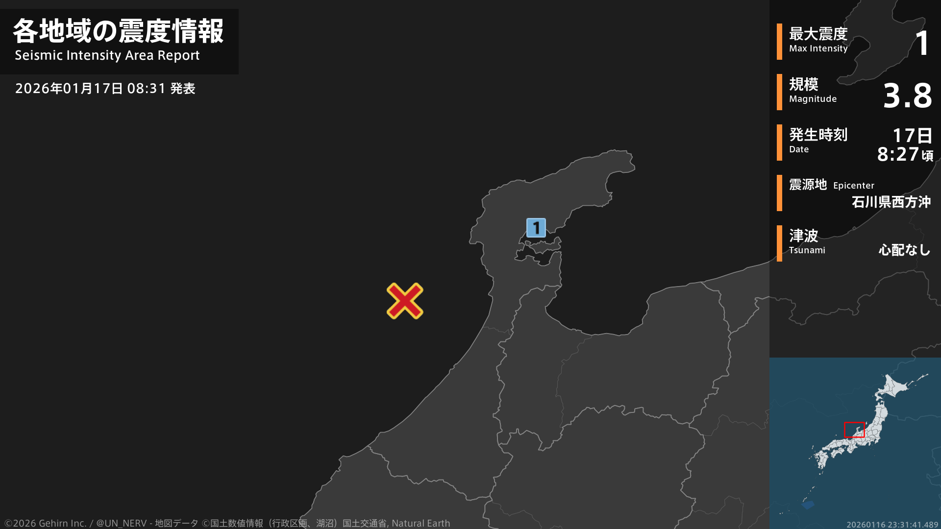 【地震情報 2026年1月17日】8時27分頃、石川県西方沖を震源とする地震がありました。震源の深さは約10km、地震の規模はM3.8、最大震度1を石川県で観測しています。この地震による津波の心配はありません。#地震 #石川県