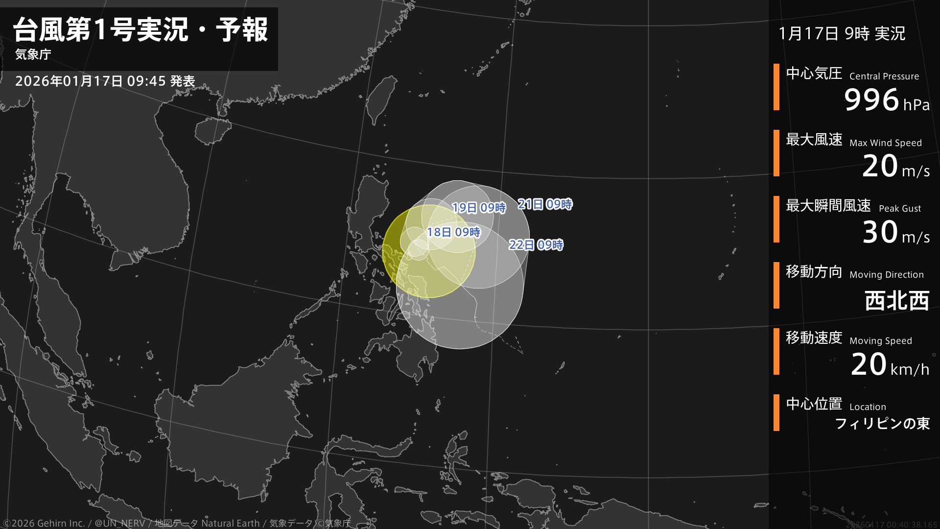 【台風第1号実況・予報 2026年01月17日 09:40】台風第1号(ノケーン)は、フィリピンの東を1時間に20キロの速さで西北西に進んでいます。#台風情報