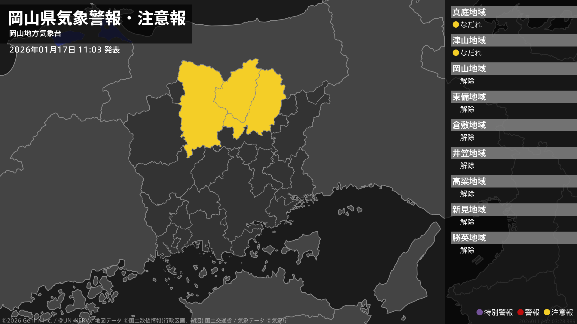 【岡山県 気象警報・注意報 2026年01月17日 11:03】