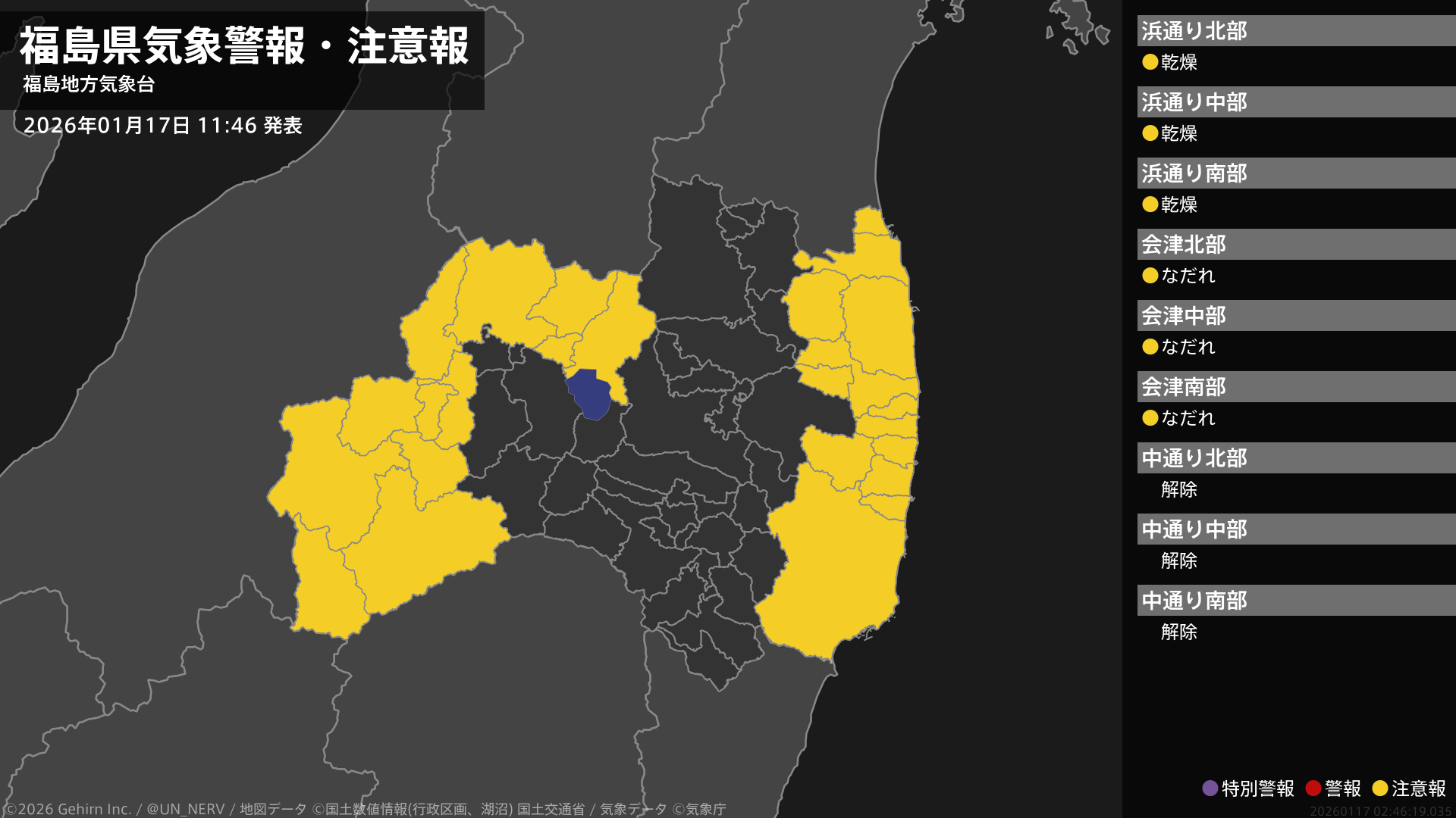 【福島県 気象警報・注意報 2026年01月17日 11:46】