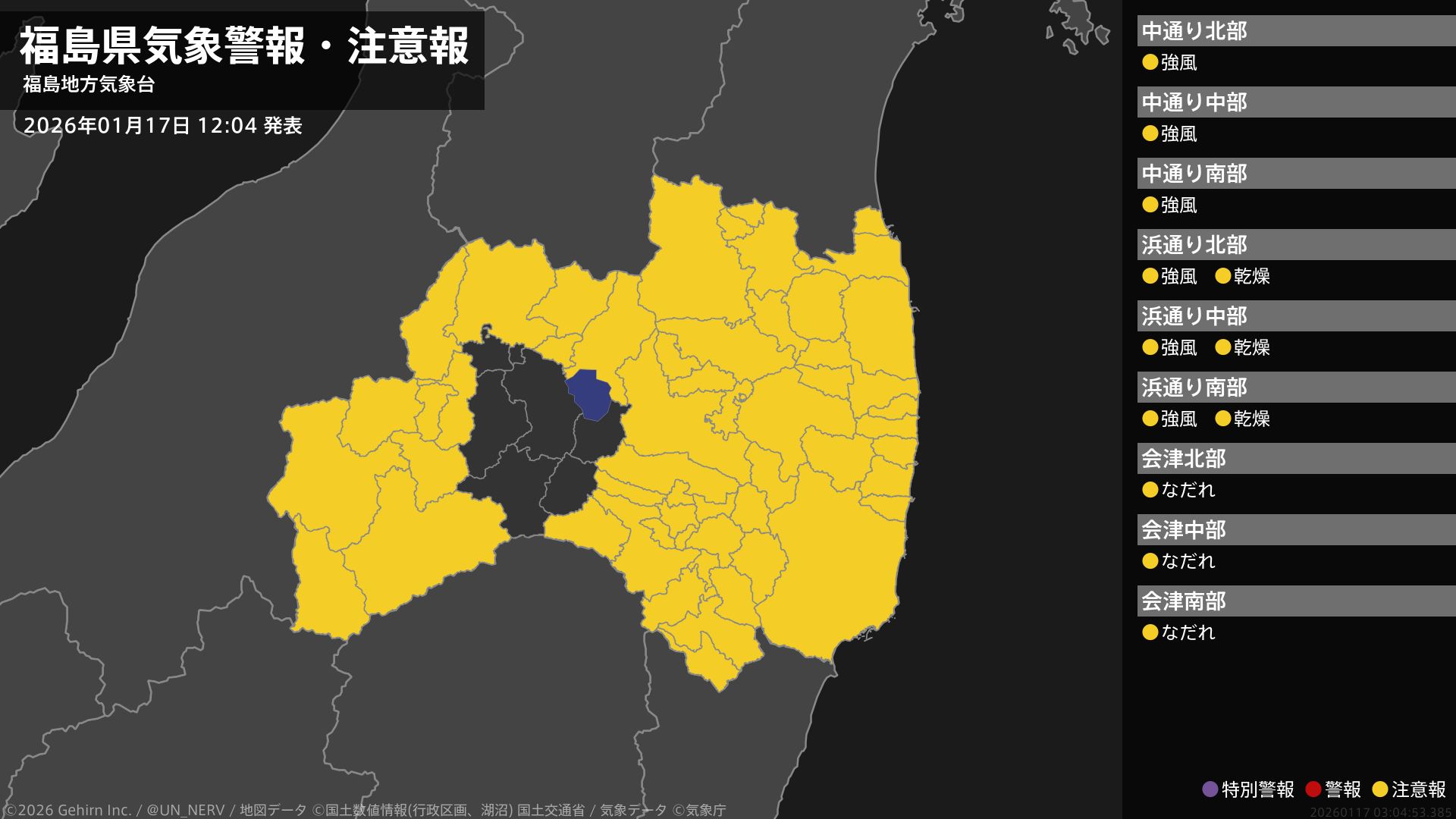 【福島県 気象警報・注意報 2026年01月17日 12:04】