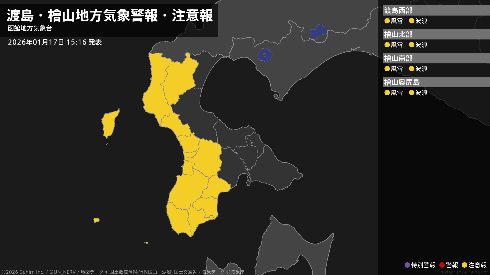 【渡島・檜山地方 気象警報・注意報 2026年01月17日 15:16】