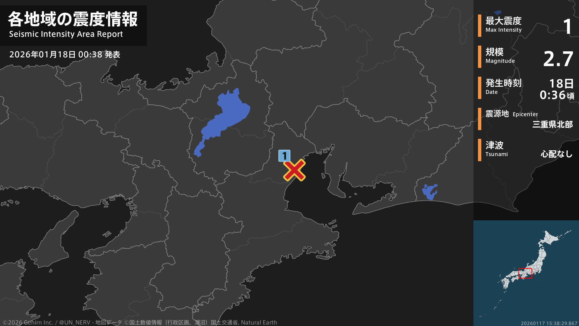 【地震情報 2026年1月18日】0時36分頃、三重県北部を震源とする地震がありました。震源の深さは約10km、地震の規模はM2.7、最大震度1を三重県で観測しています。この地震による津波の心配はありません。#地震 #三重県