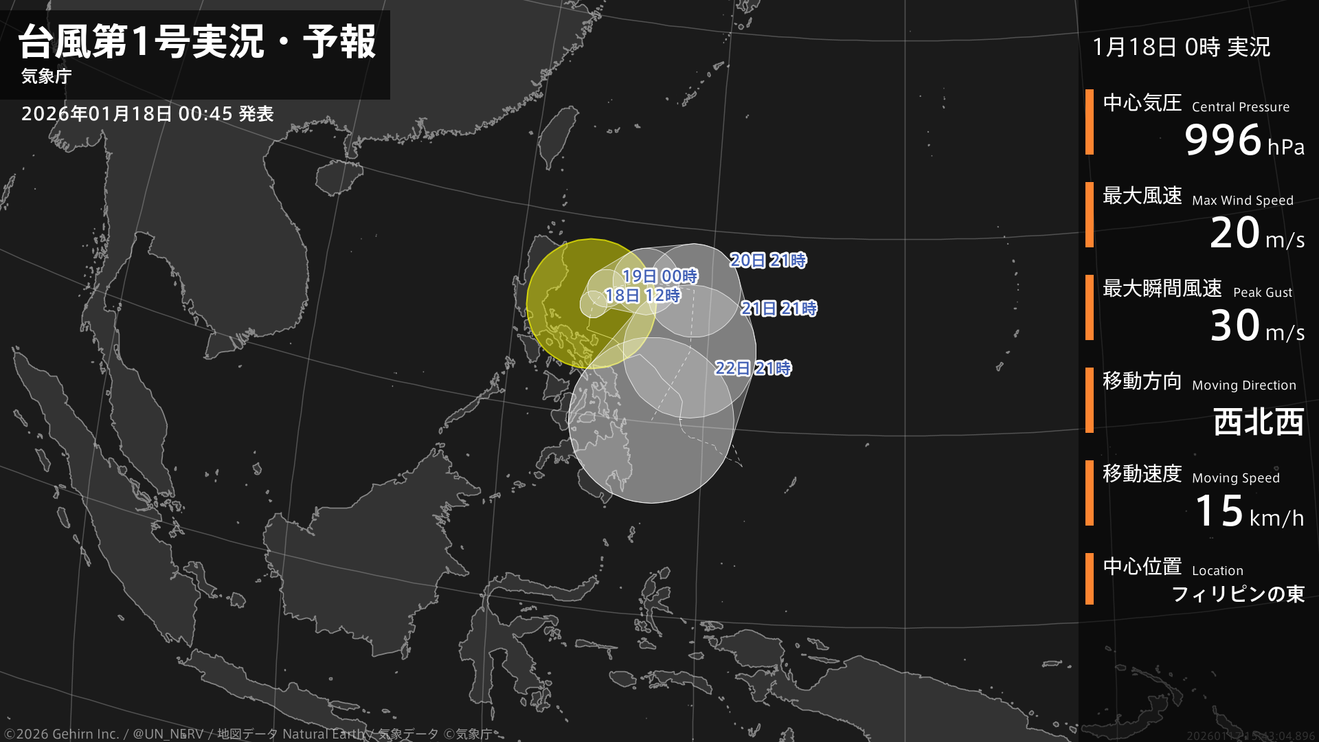 【台風第1号実況・予報 2026年01月18日 00:43】台風第1号(ノケーン)は、フィリピンの東を1時間に15キロの速さで西北西に進んでいます。#台風情報