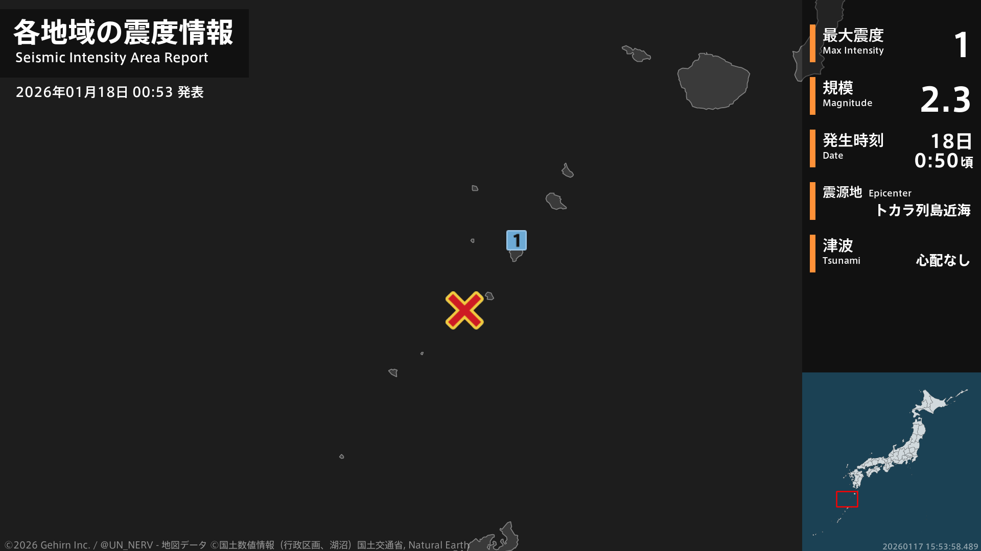 【地震情報 2026年1月18日】0時50分頃、トカラ列島近海を震源とする地震がありました。震源の深さは約20km、地震の規模はM2.3、最大震度1を鹿児島県で観測しています。この地震による津波の心配はありません。#地震 #鹿児島県