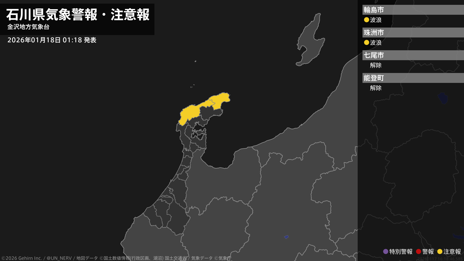 【石川県 気象警報・注意報 2026年01月18日 01:18】能登では、18日朝まで高波に注意してください。#気象警報注意報 #石川県