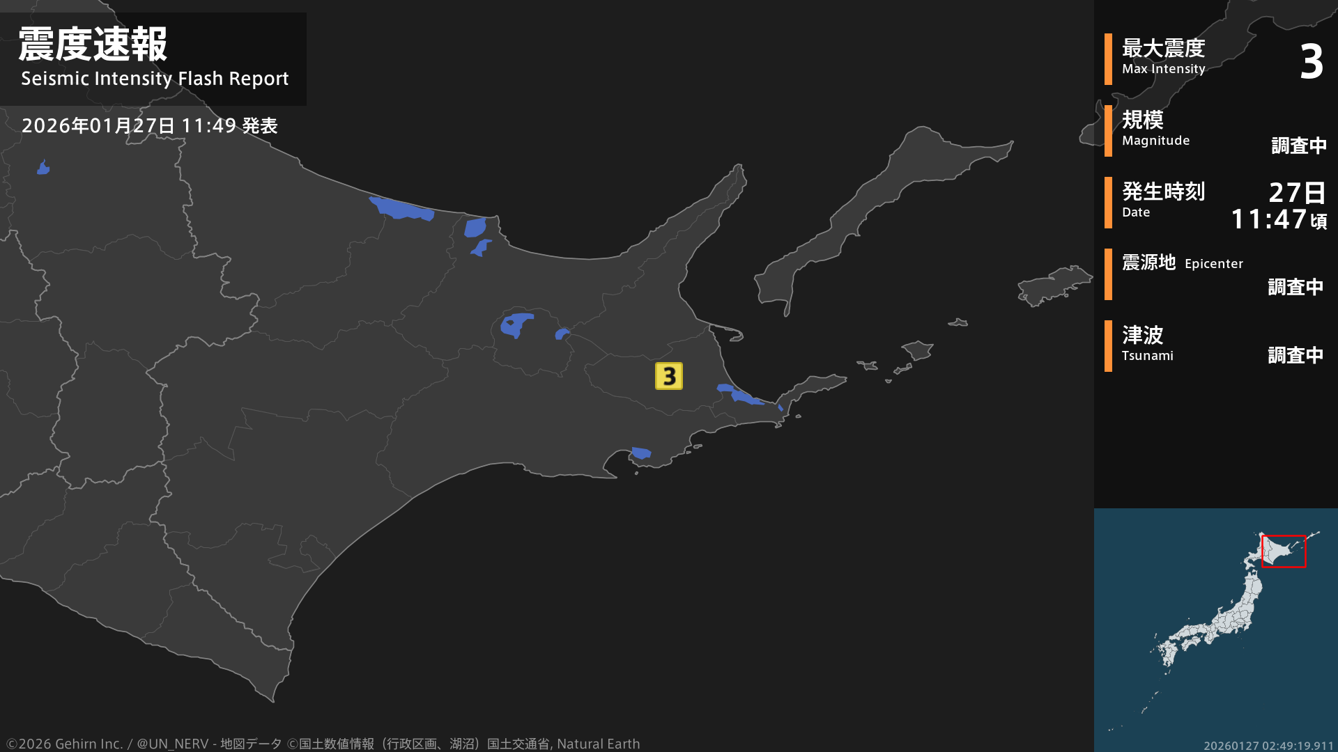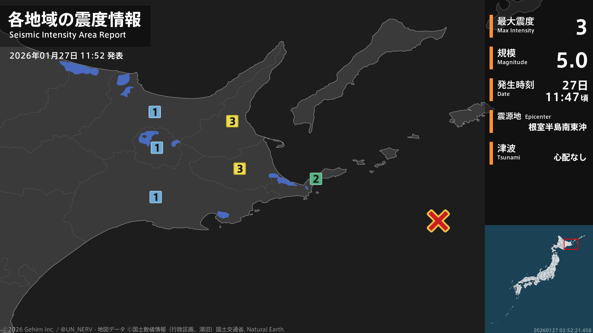 11時47分頃、根室半島南東沖を震源とする地震がありました。地震の規模はM4.8程度、最大震度3程度と推定されています。この情報は気象庁の予報に基づく推定です。情報は誤差を含む場合があります。