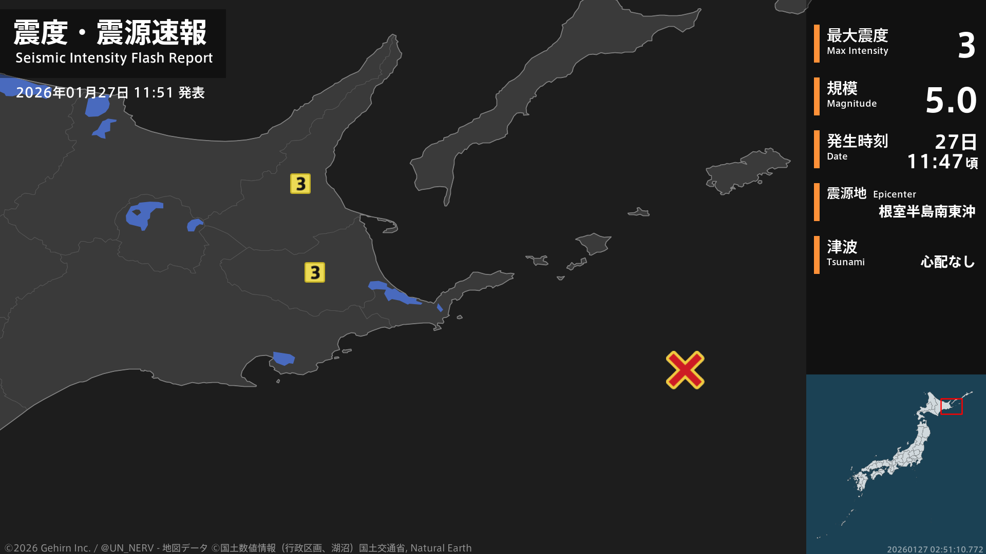 11時47分頃、根室半島南東沖を震源とする地震がありました。震源の深さは約40km、地震の規模はM5.0、最大震度3を北海道で観測しています。この地震による津波の心配はありません。