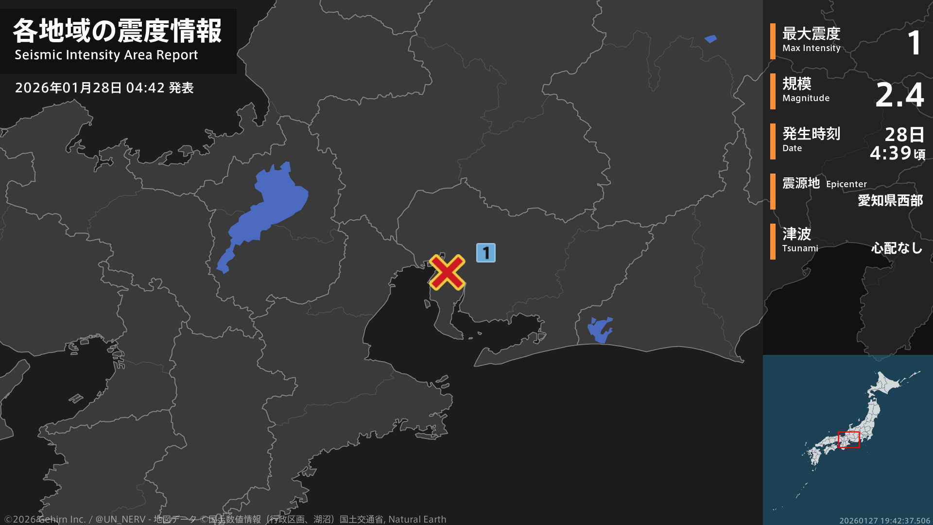【地震情報 2026年1月28日】4時39分頃、愛知県西部を震源とする地震がありました。震源の深さは約20km、地震の規模はM2.4、最大震度1を愛知県で観測しています。この地震による津波の心配はありません。#地震 #愛知県