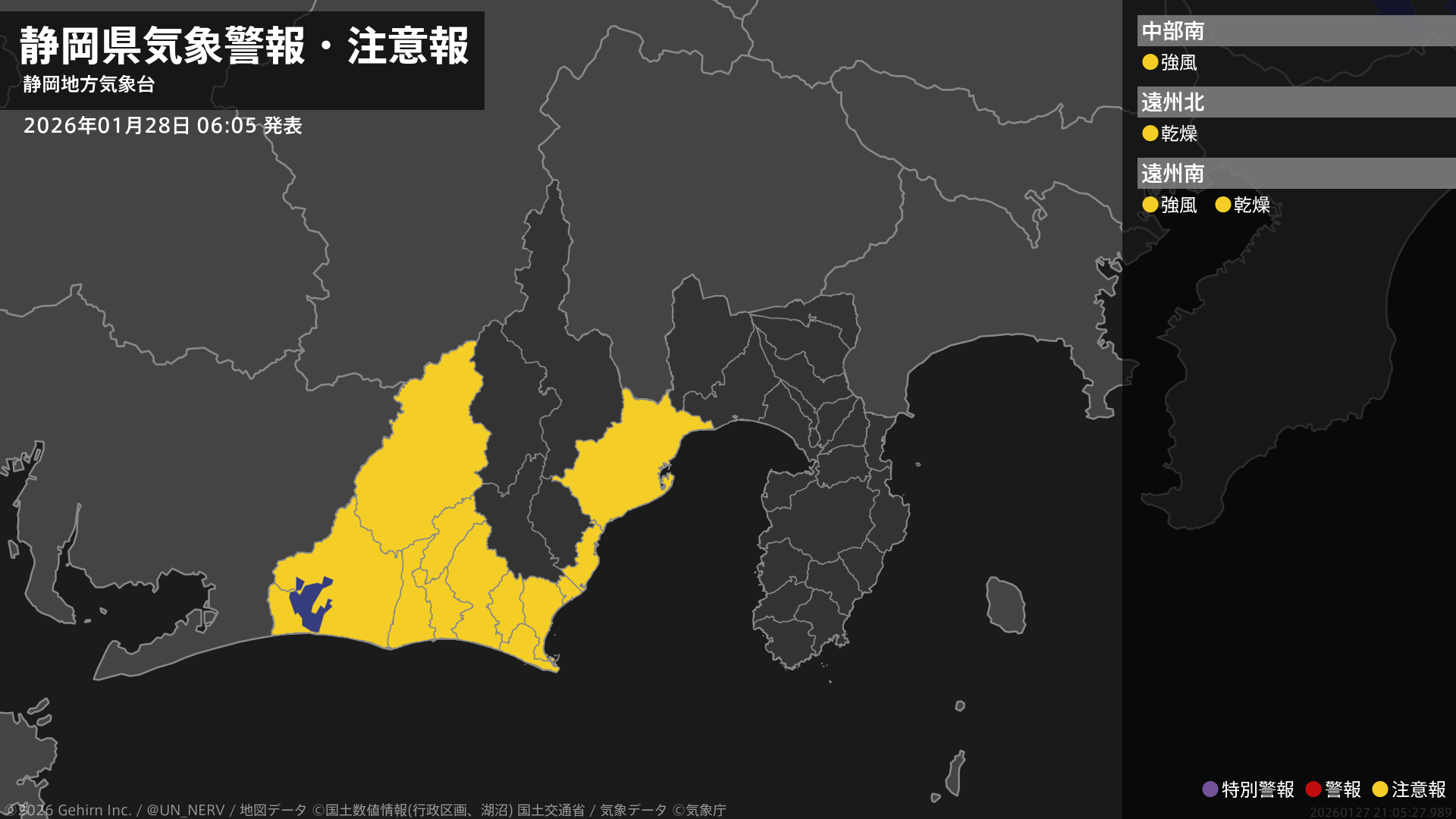 【静岡県 気象警報・注意報 2026年01月28日 06:05】中部、西部では、28日昼過ぎから28日夜遅くまで強風に注意してください。西部では、28日まで空気の乾燥した状態が続くため、火の取り扱いに注意してください。#気象警報注意報 #静岡県