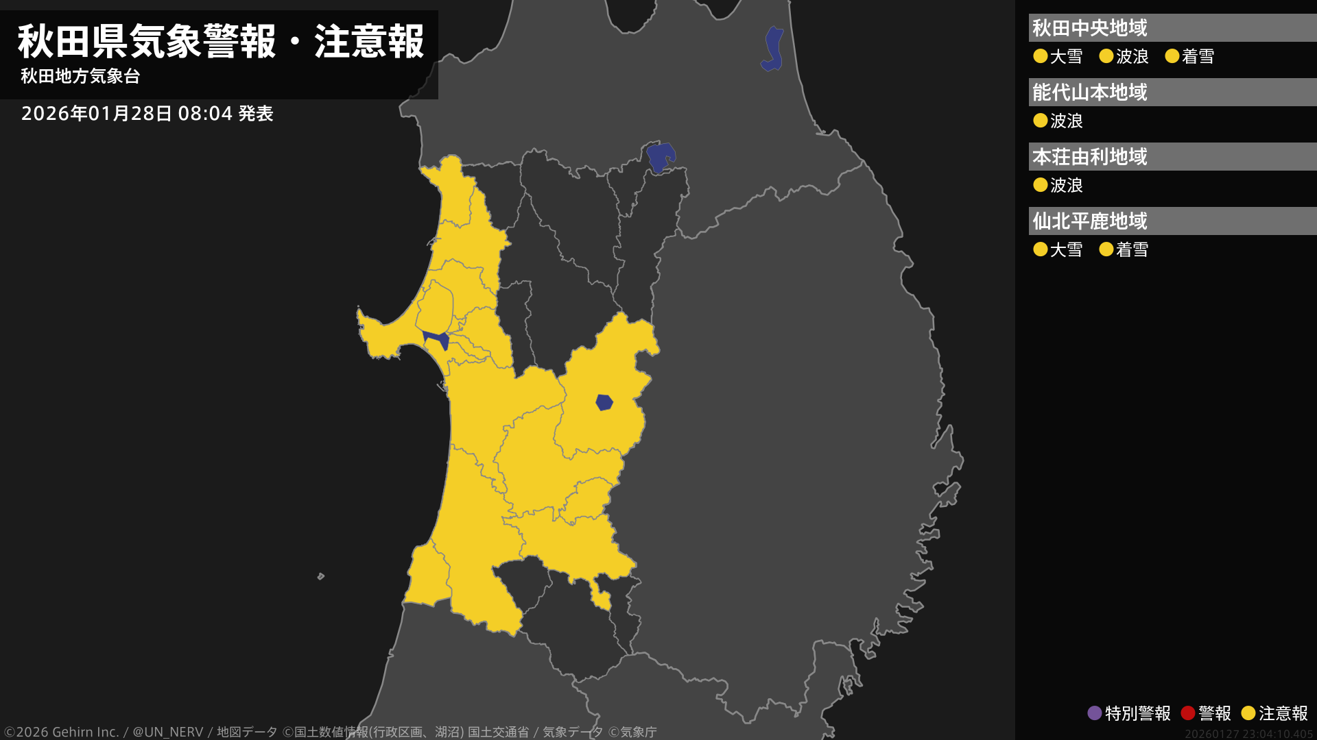 【秋田県 気象警報・注意報 2026年01月28日 08:04】