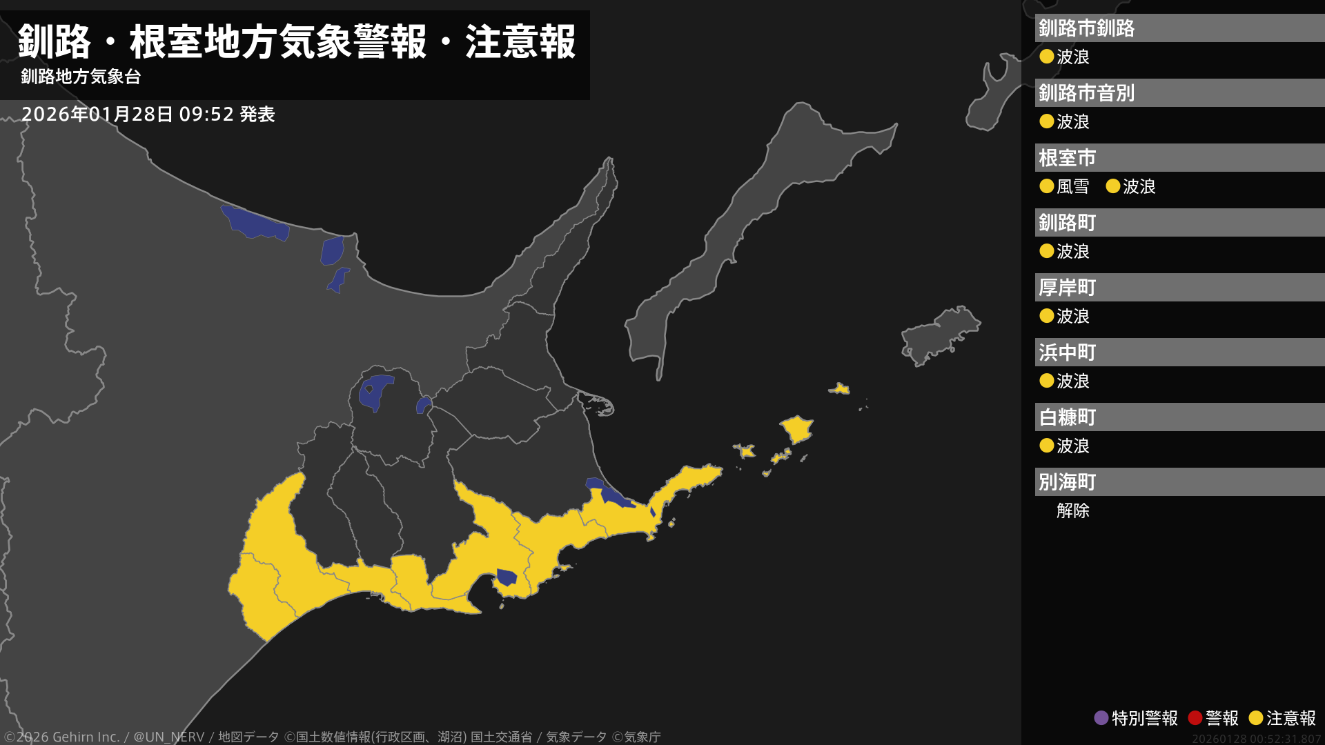【釧路・根室地方 気象警報・注意報 2026年01月28日 09:52】
