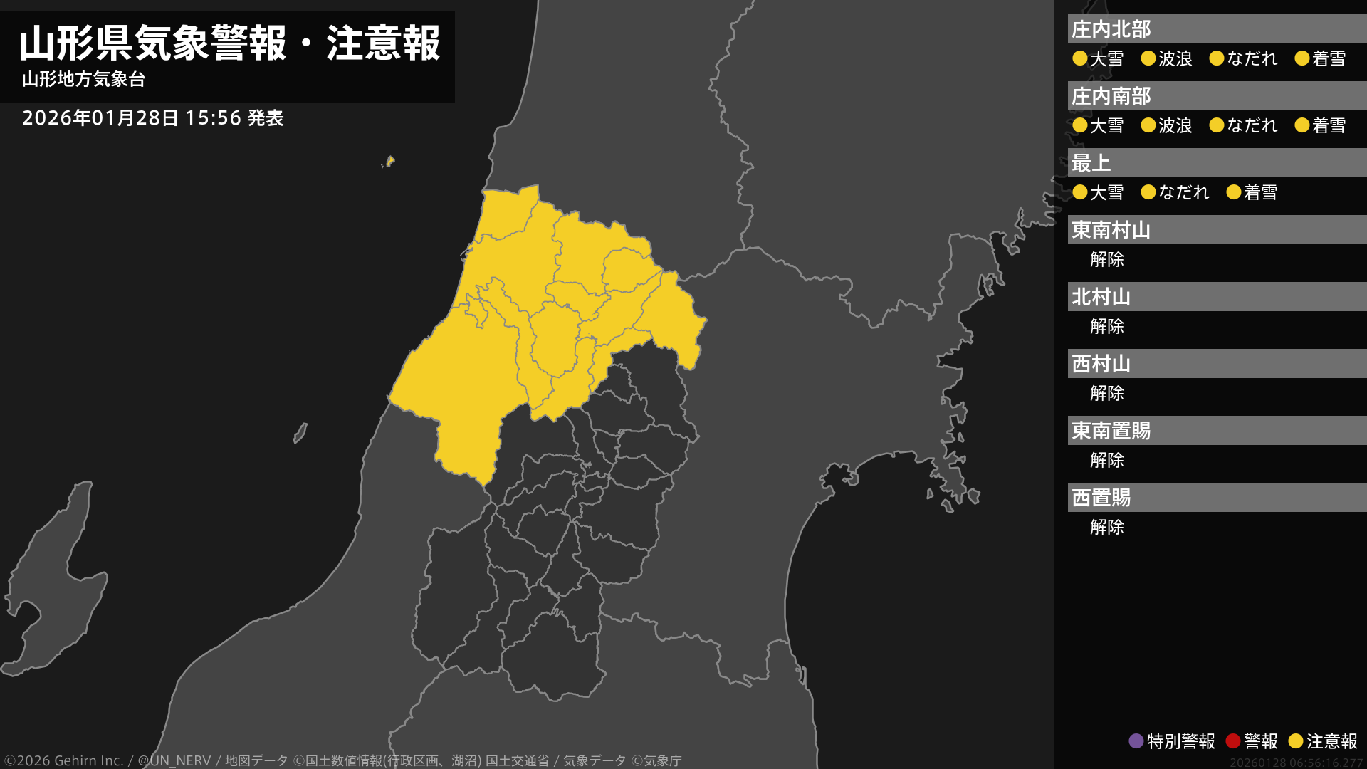 【山形県 気象警報・注意報 2026年01月28日 15:56】庄内、最上では、大雪やなだれ、電線等への着雪に注意してください。庄内では、高波に注意してください。#気象警報注意報 #山形県