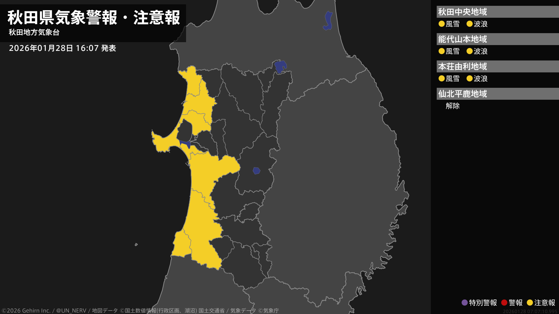 【秋田県 気象警報・注意報 2026年01月28日 16:07】沿岸では、風雪や高波に注意してください。#気象警報注意報 #秋田県