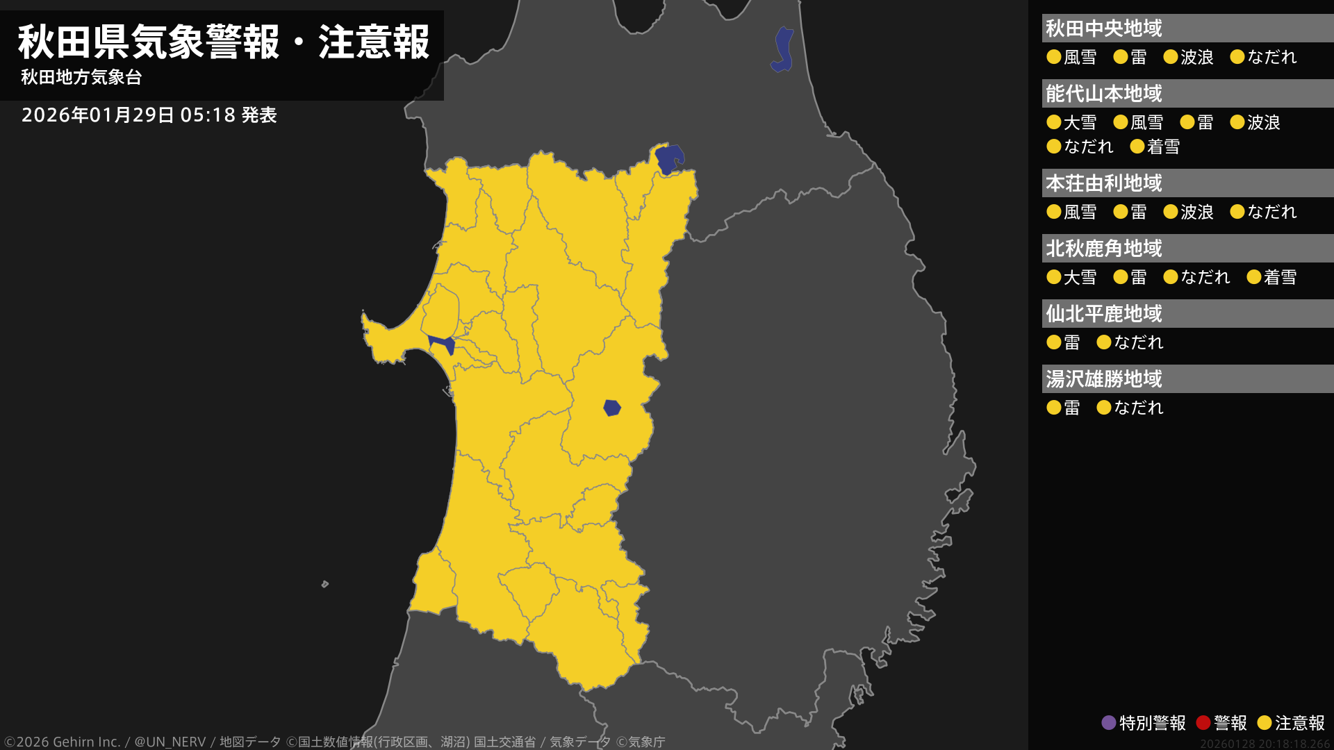 【秋田県 気象警報・注意報 2026年01月29日 05:18】沿岸では、風雪や高波に注意してください。秋田県では、大雪や落雷、なだれ、電線等への着雪に注意してください。#気象警報注意報 #秋田県