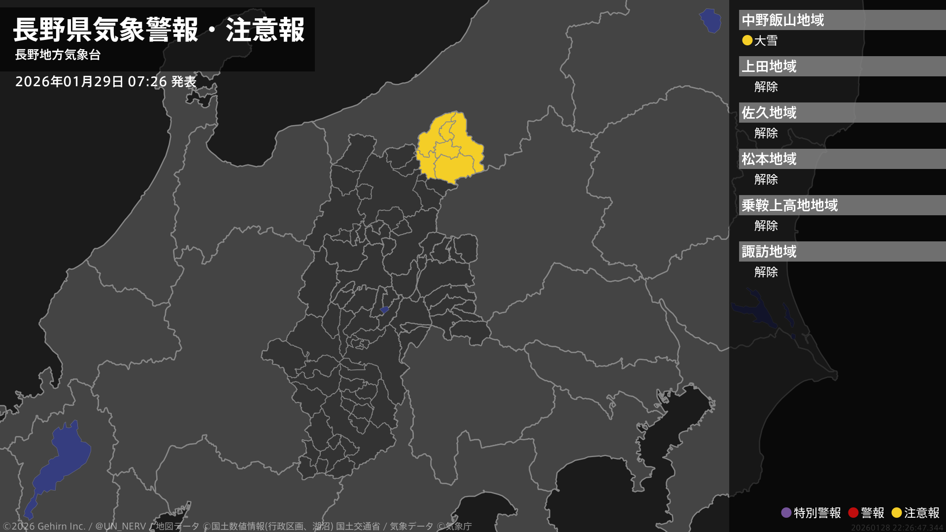 【長野県 気象警報・注意報 2026年01月29日 07:26】