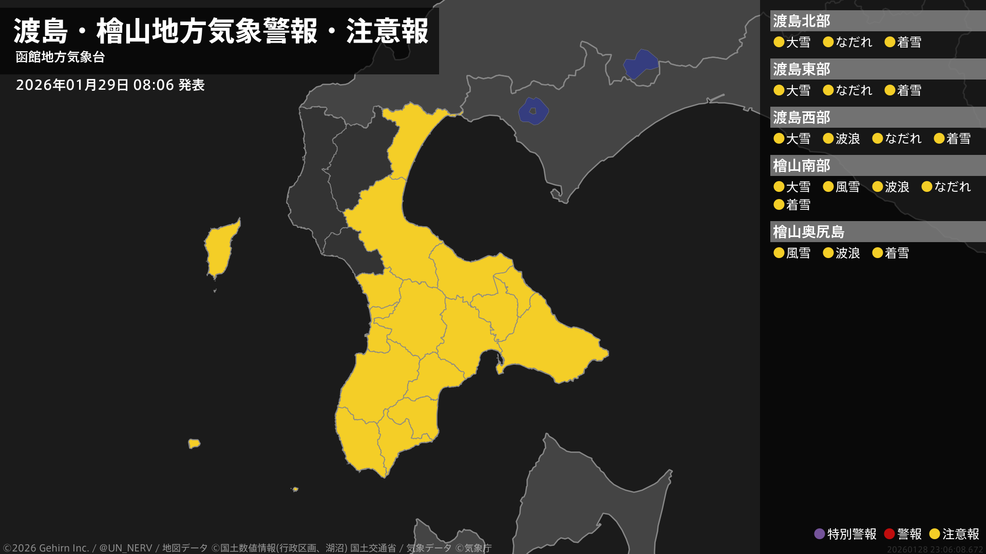 【渡島・檜山地方 気象警報・注意報 2026年01月29日 08:06】