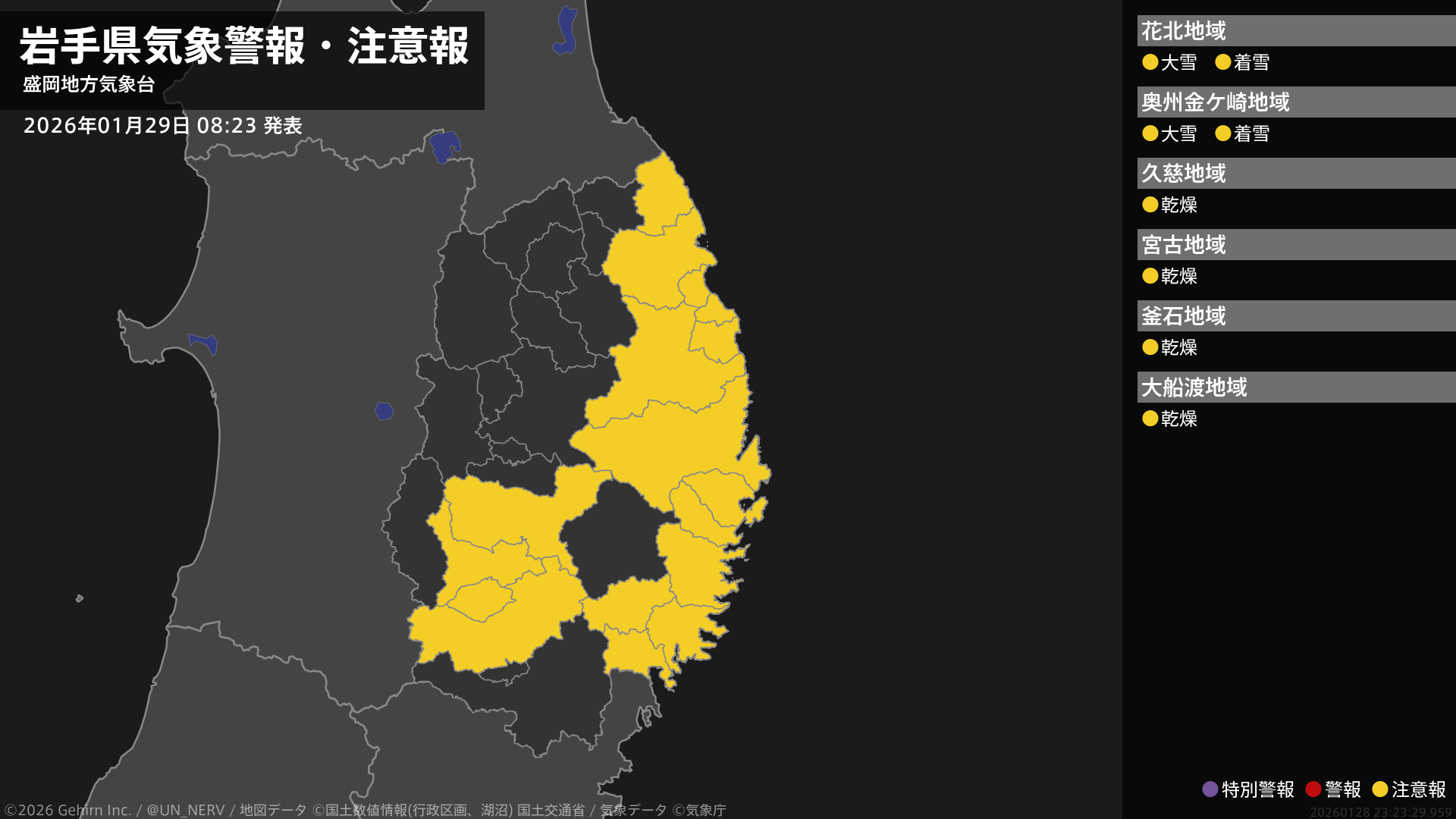 【岩手県 気象警報・注意報 2026年01月29日 08:23】