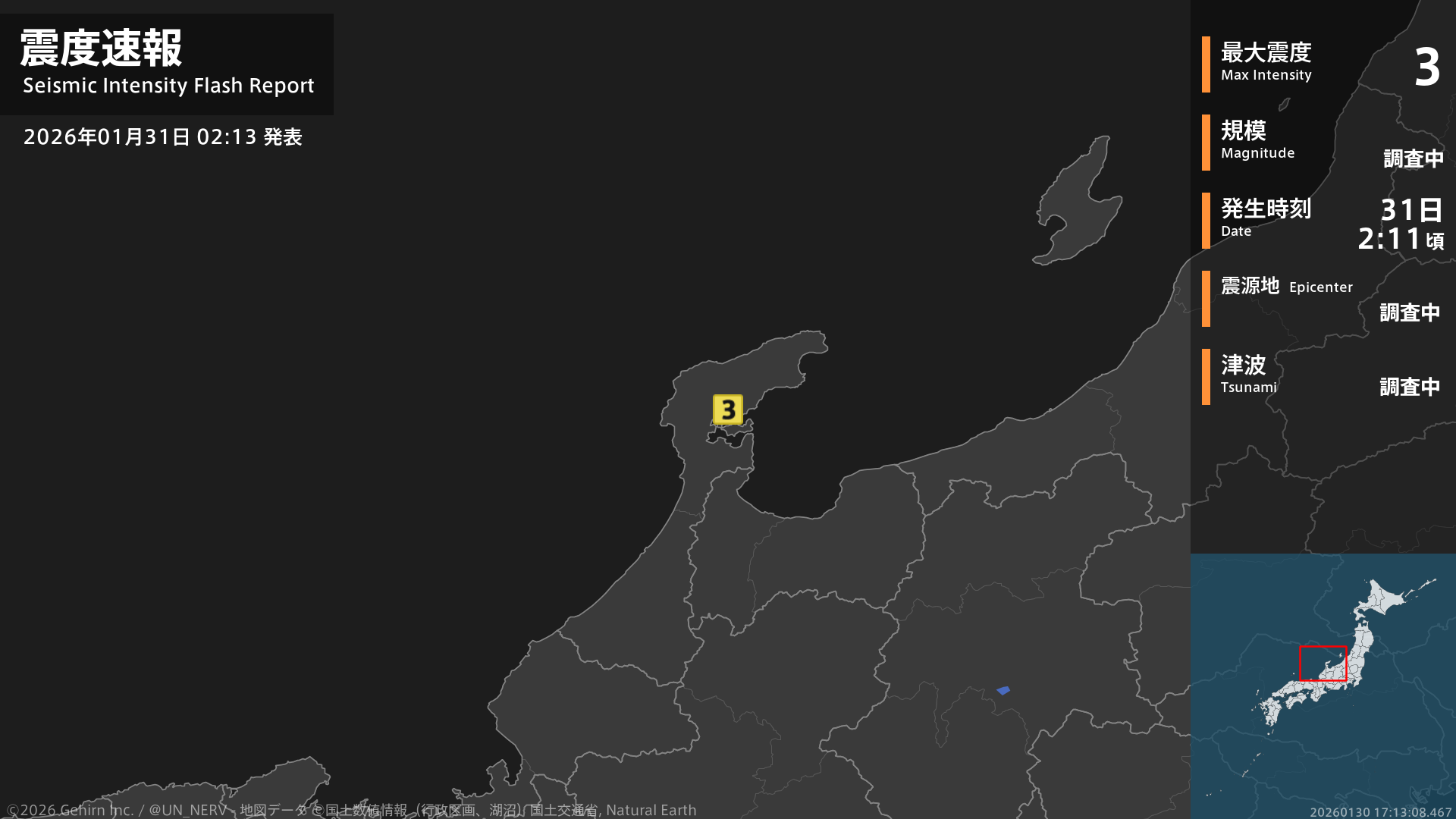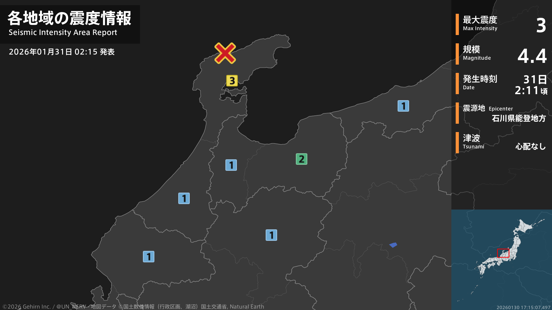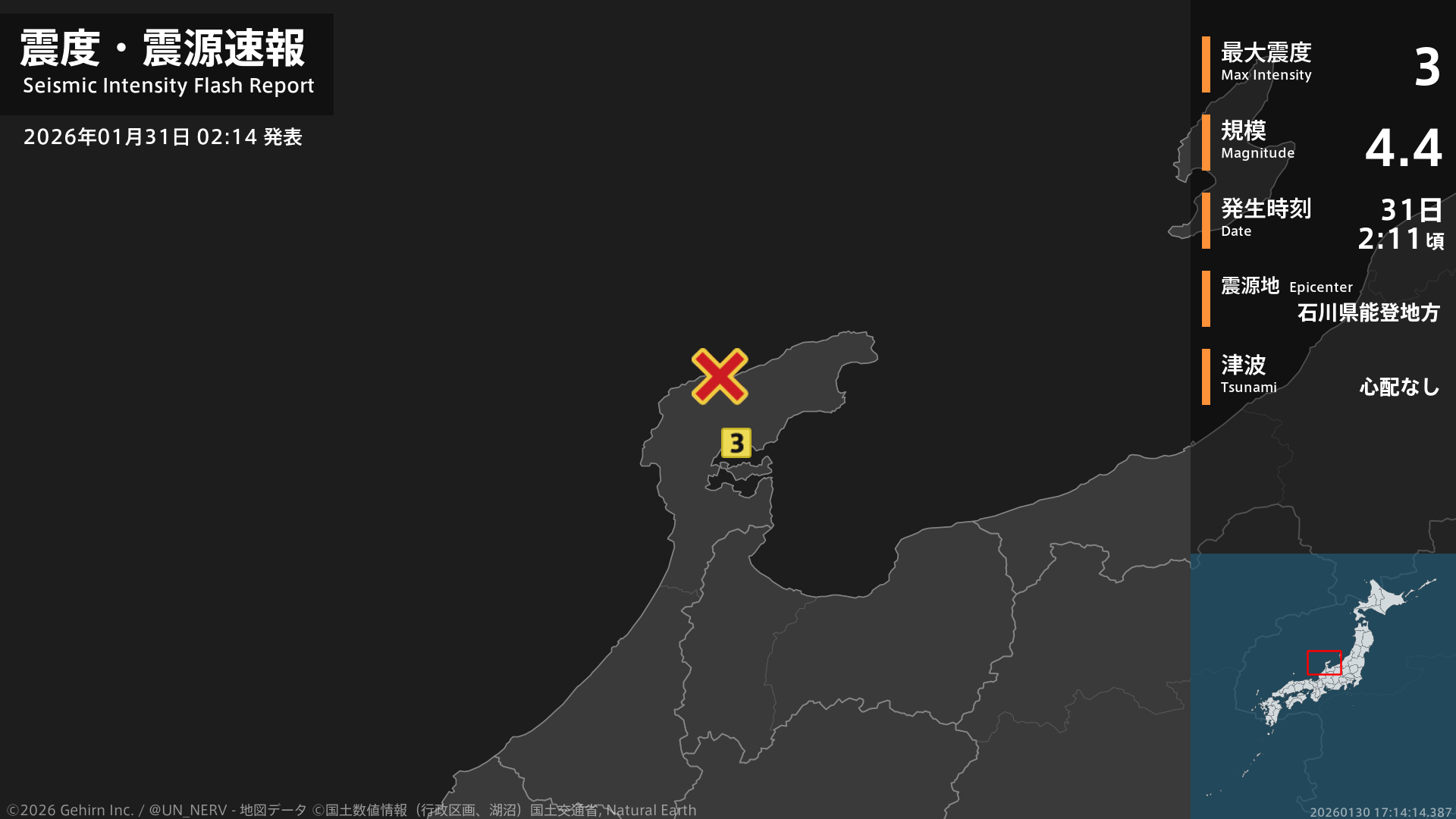 2時11分頃、石川県能登地方を震源とする地震がありました。地震の規模はM4.0程度、最大震度3程度と推定されています。この情報は気象庁の予報に基づく推定です。情報は誤差を含む場合があります。