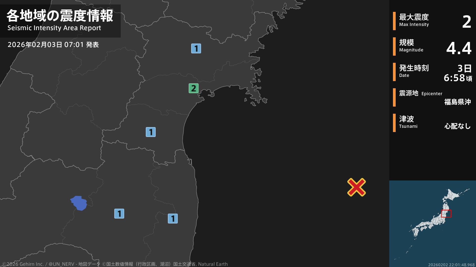 6時58分頃、福島県沖を震源とする地震がありました。震源の深さは約30km、地震の規模はM4.4、最大震度2を宮城県で観測しています。この地震による津波の心配はありません。