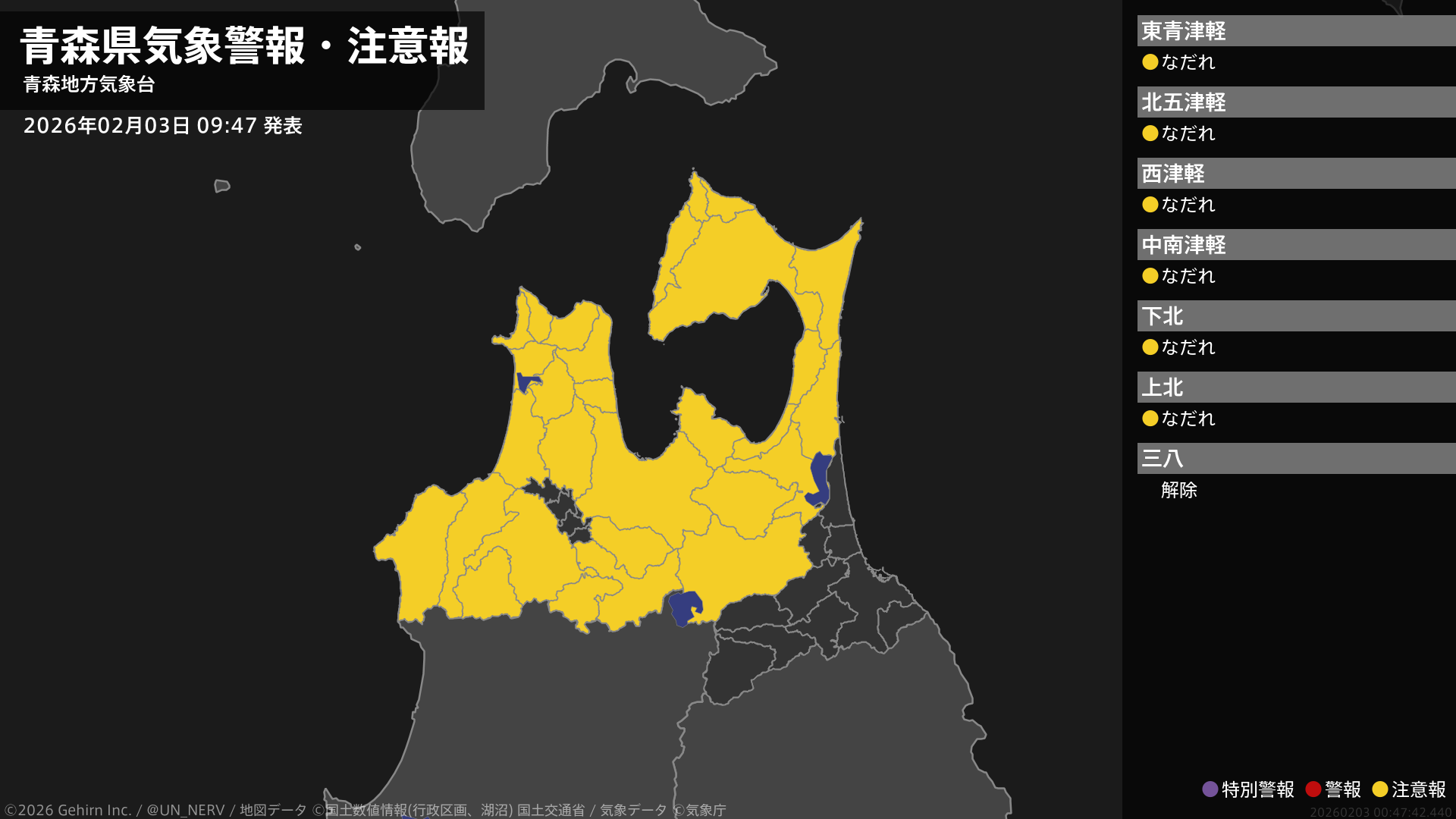 【青森県 気象警報・注意報 2026年02月03日 09:47】