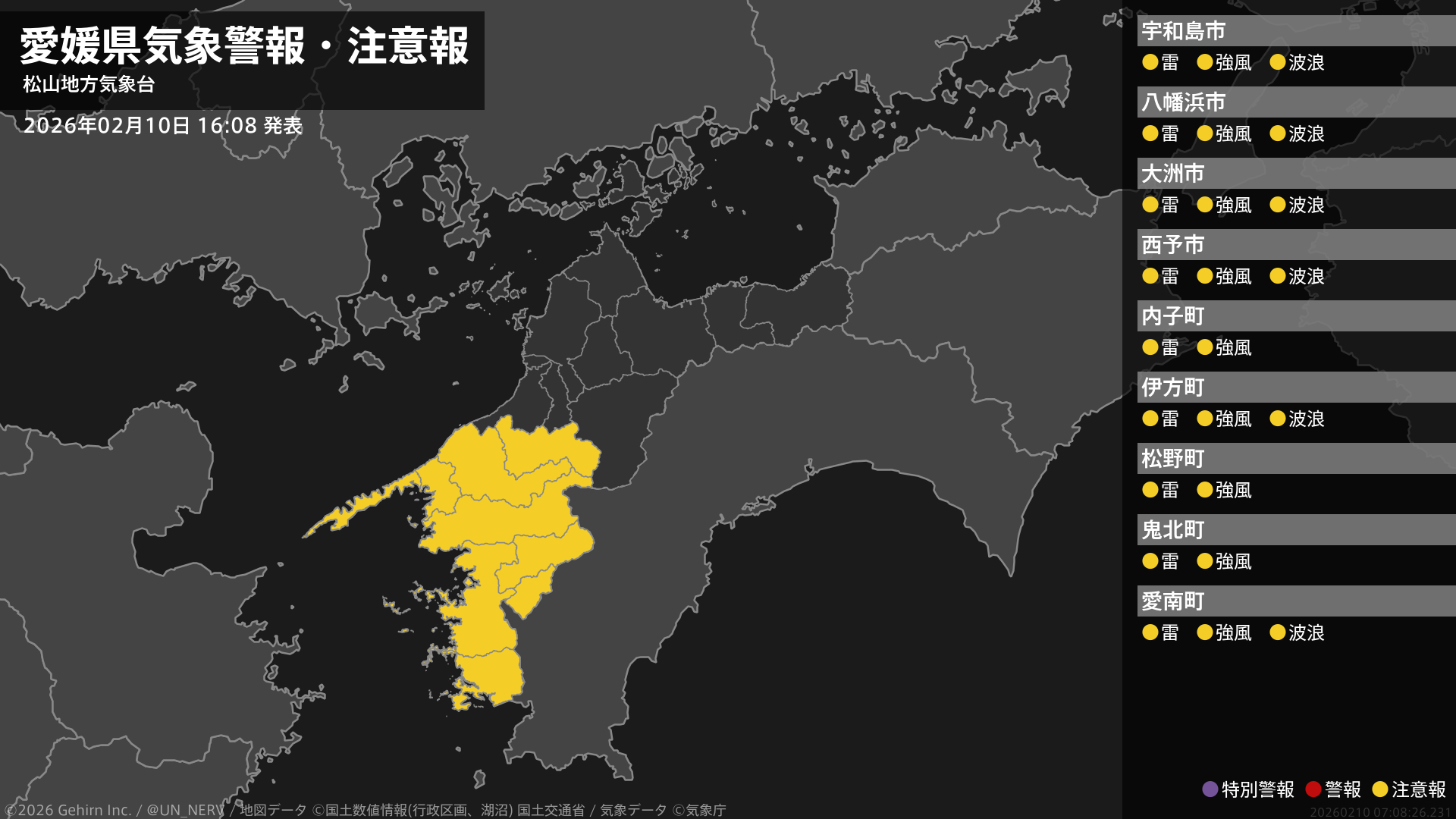 【愛媛県 気象警報・注意報 2026年02月10日 16:08】南予では、10日夜遅くから11日夕方まで強風や高波に、10日夜遅くから11日明け方まで急な強い雨や落雷に注意してください。#気象警報注意報 #愛媛県