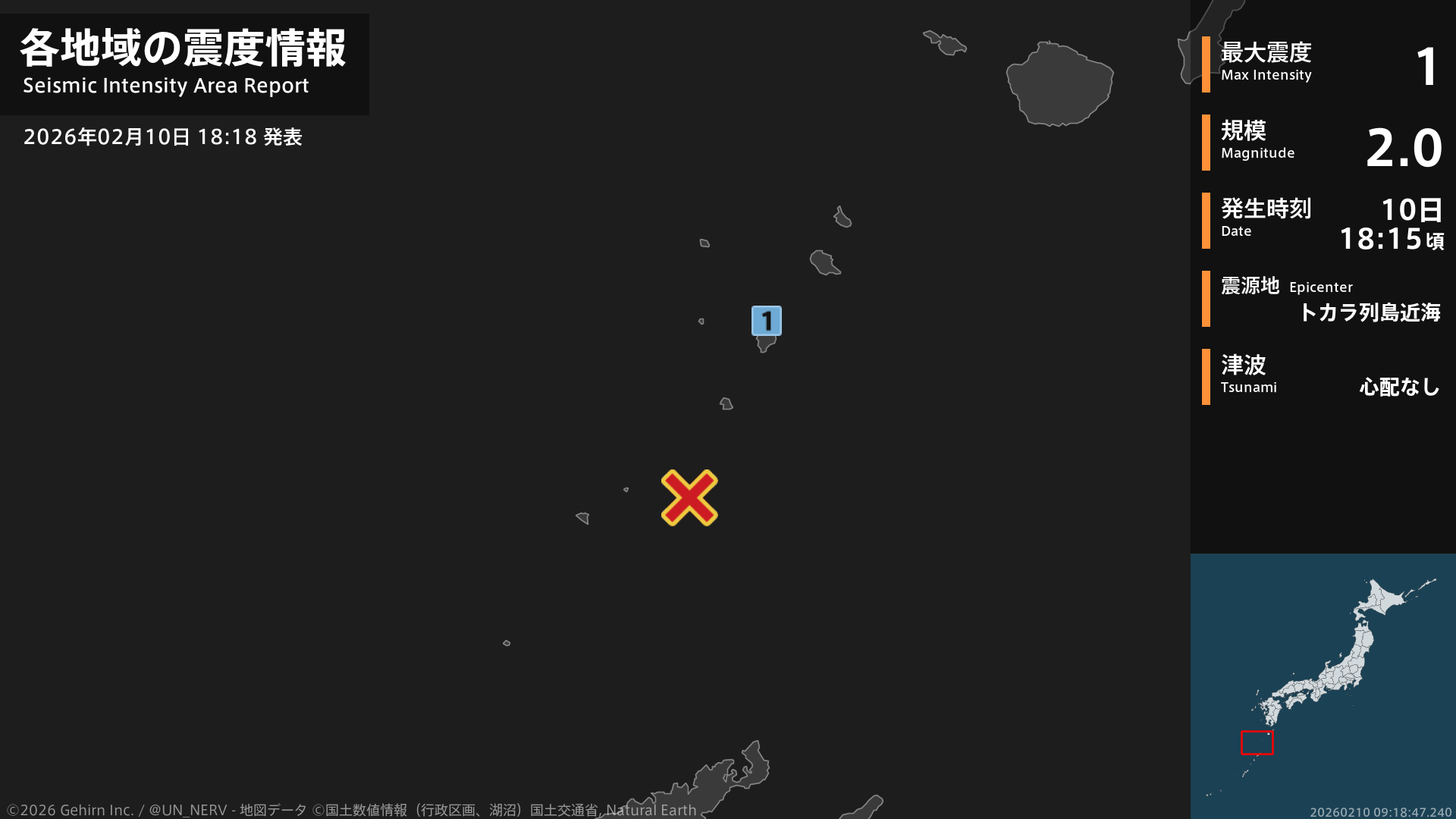 【地震情報 2026年2月10日】18時15分頃、トカラ列島近海を震源とする地震がありました。震源の深さは約10km、地震の規模はM2.0、最大震度1を鹿児島県で観測しています。この地震による津波の心配はありません。#地震 #鹿児島県