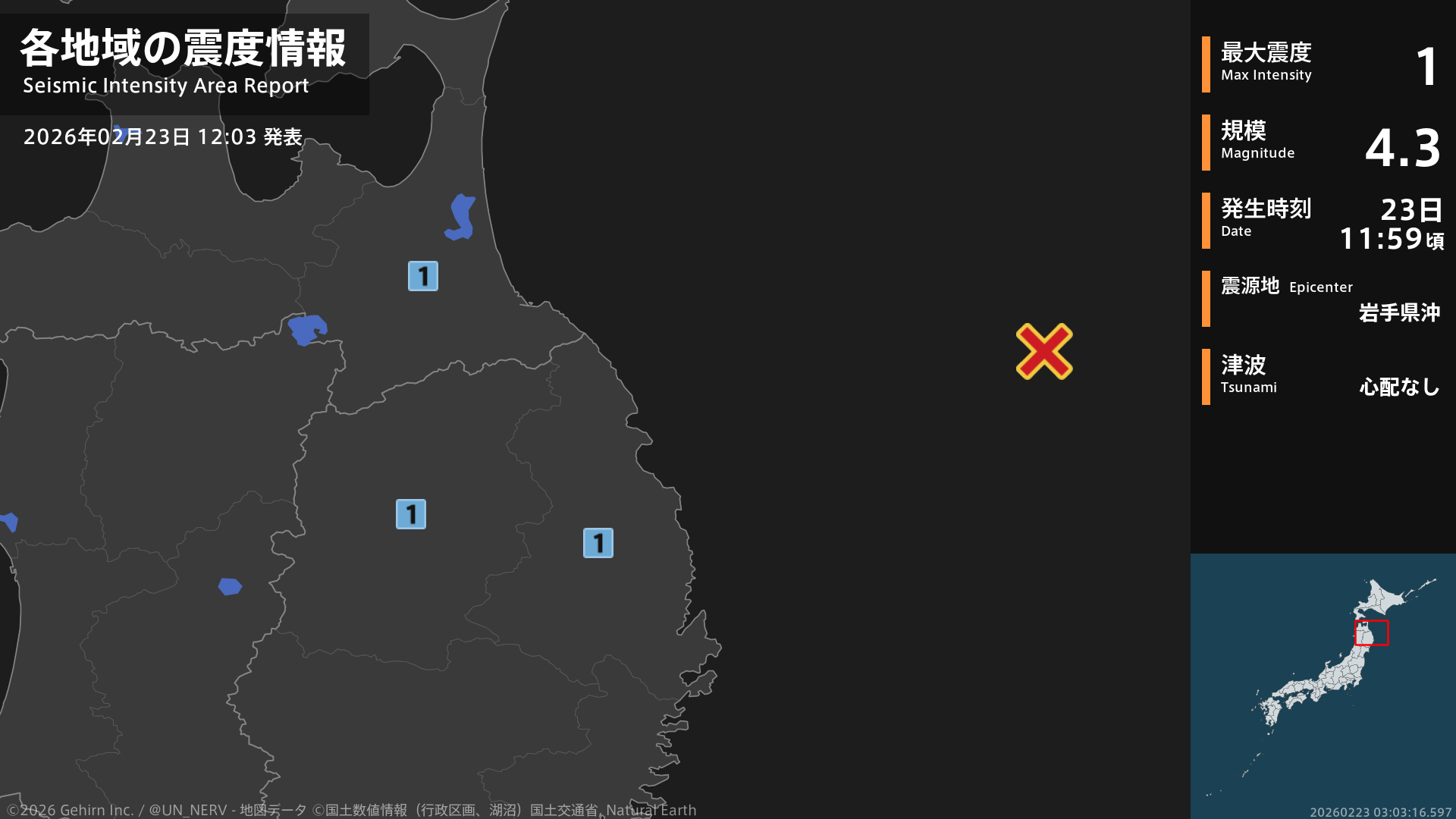 11時59分頃、岩手県沖を震源とする地震がありました。震源の深さは約30km、地震の規模はM4.3、最大震度1を青森県、岩手県で観測しています。この地震による津波の心配はありません。