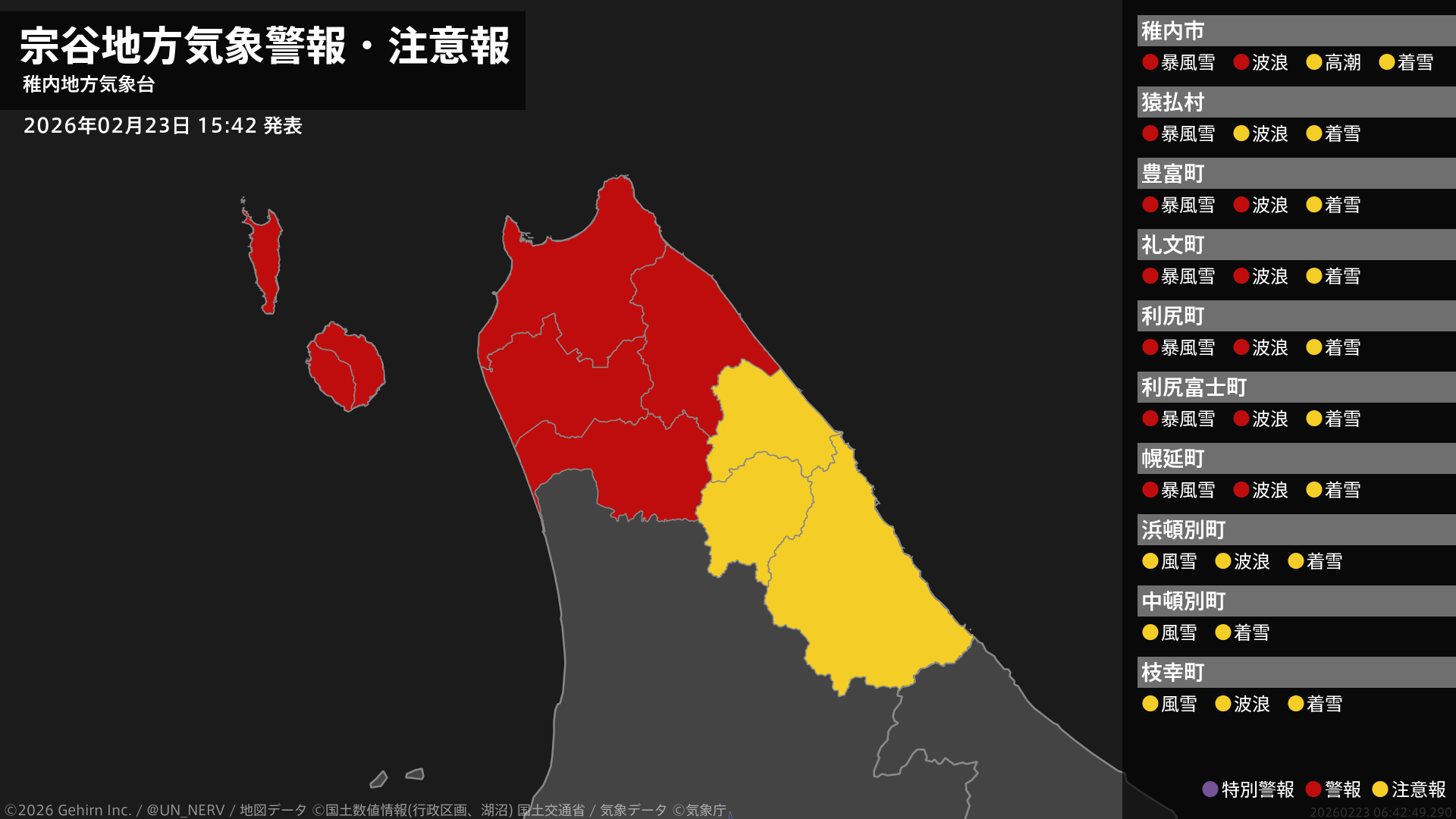 【宗谷地方 気象警報・注意報 2026年02月23日 15:42】