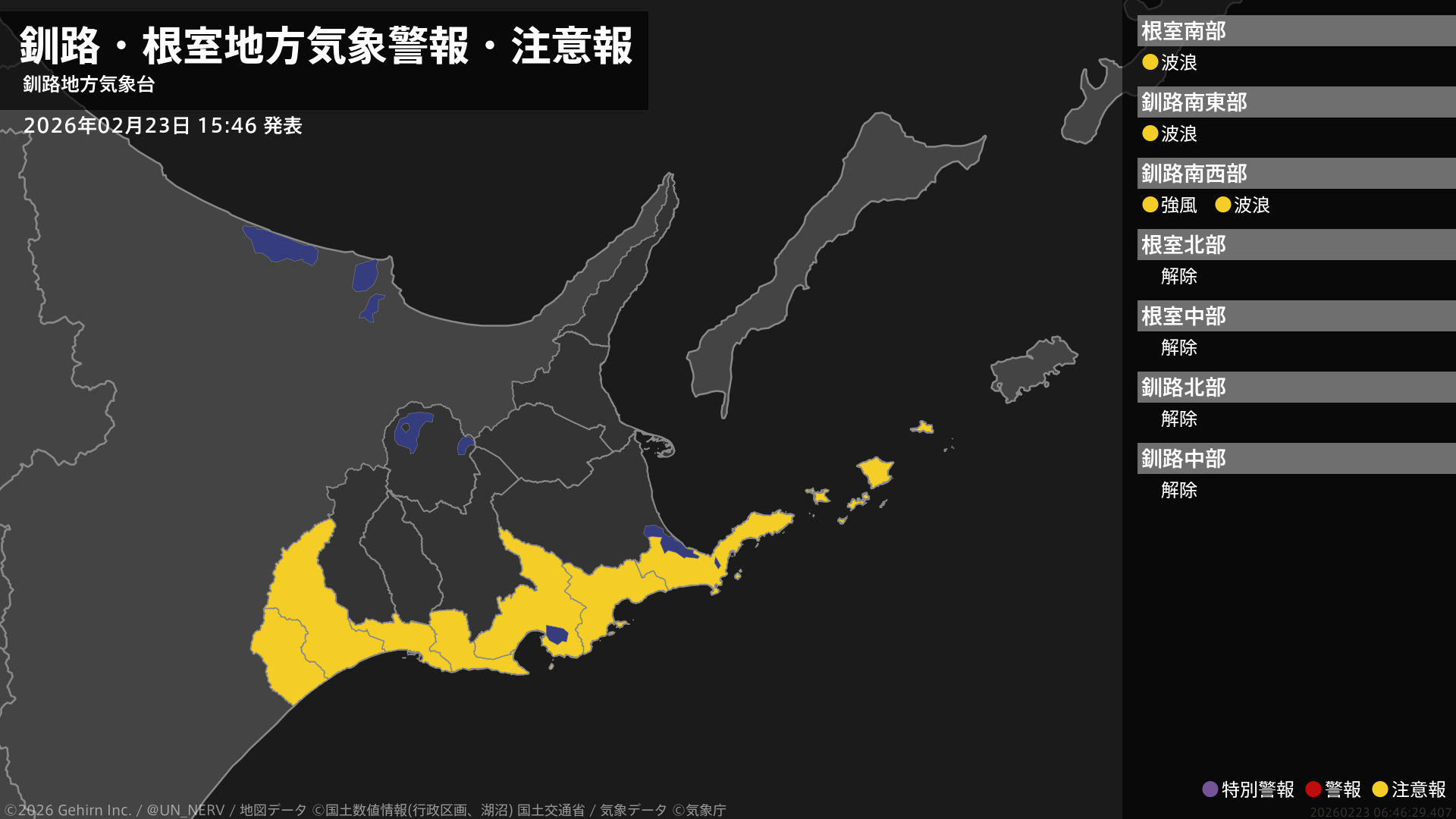 【釧路・根室地方 気象警報・注意報 2026年02月23日 15:46】