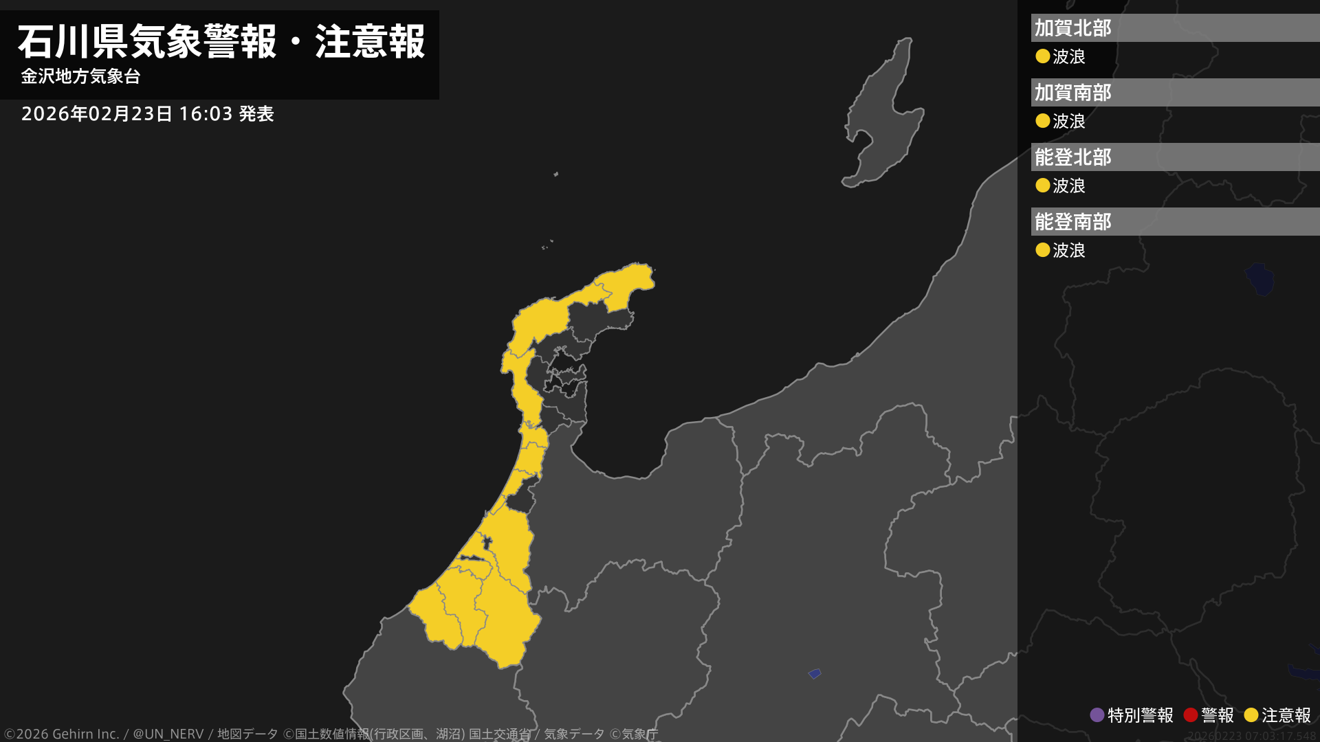 【石川県 気象警報・注意報 2026年02月23日 16:03】