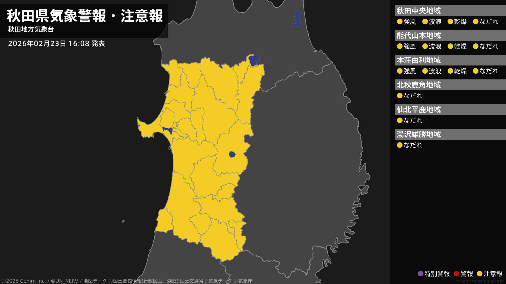 【秋田県 気象警報・注意報 2026年02月23日 16:08】