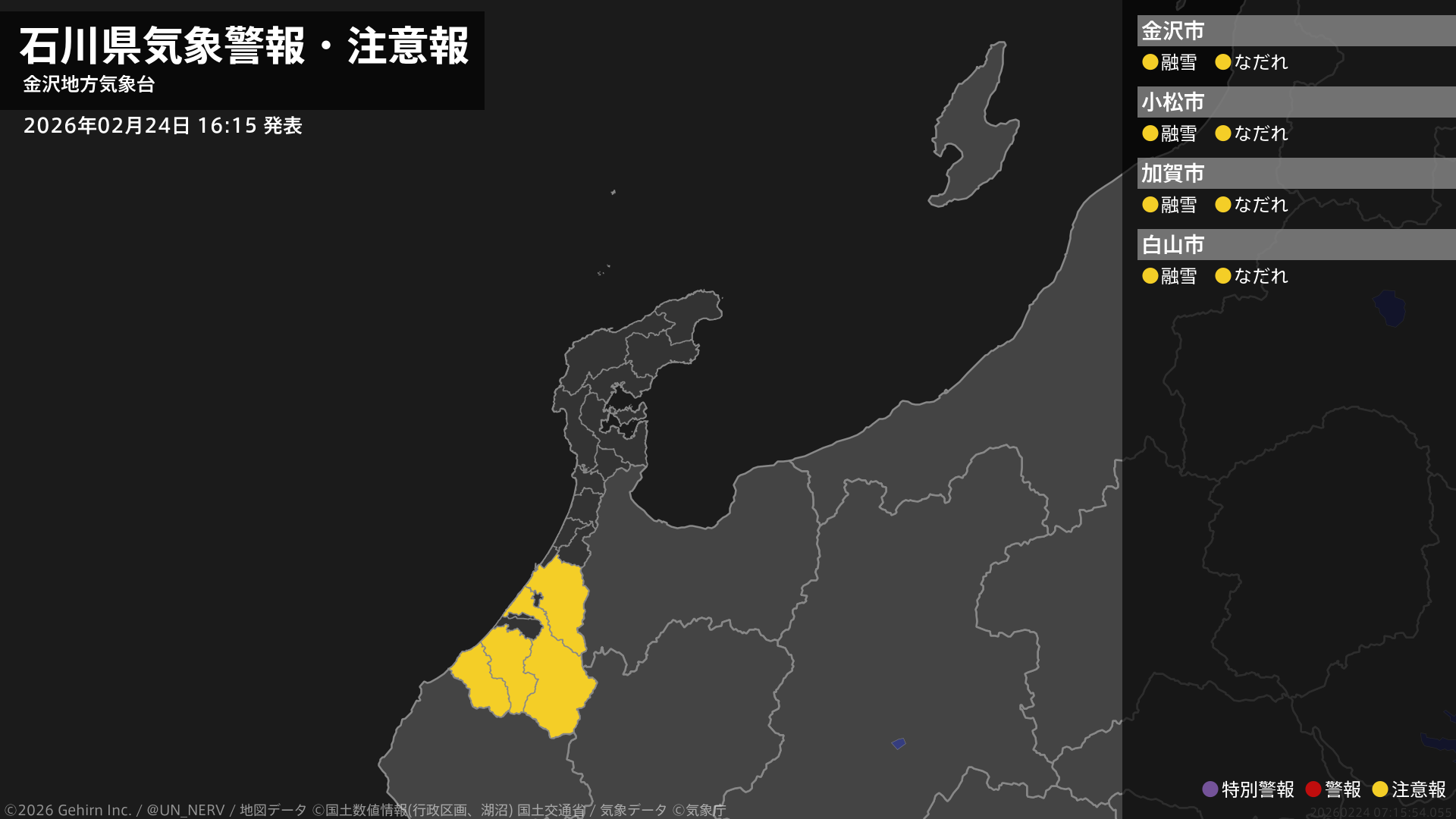 【石川県 気象警報・注意報 2026年02月24日 16:15】