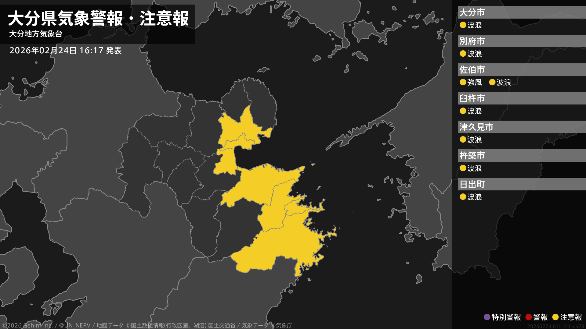 【大分県 気象警報・注意報 2026年02月24日 16:17】