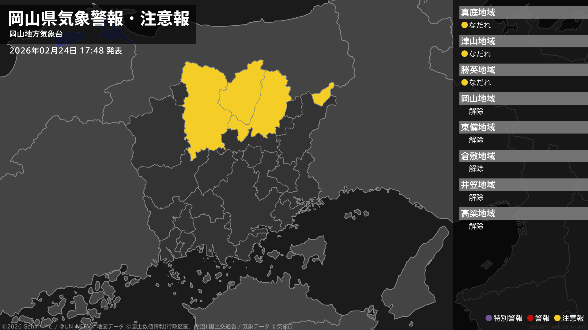 【岡山県 気象警報・注意報 2026年02月24日 17:48】