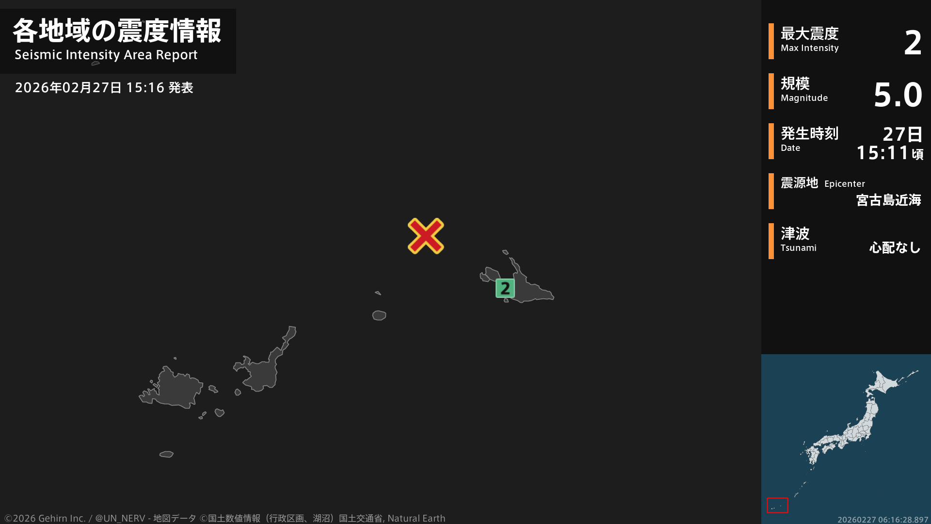 15時43分頃、宮古島北西沖を震源とする地震がありました。地震の規模はM4.7程度、最大震度2程度と推定されています。この情報は気象庁の予報に基づく推定です。情報は誤差を含む場合があります。