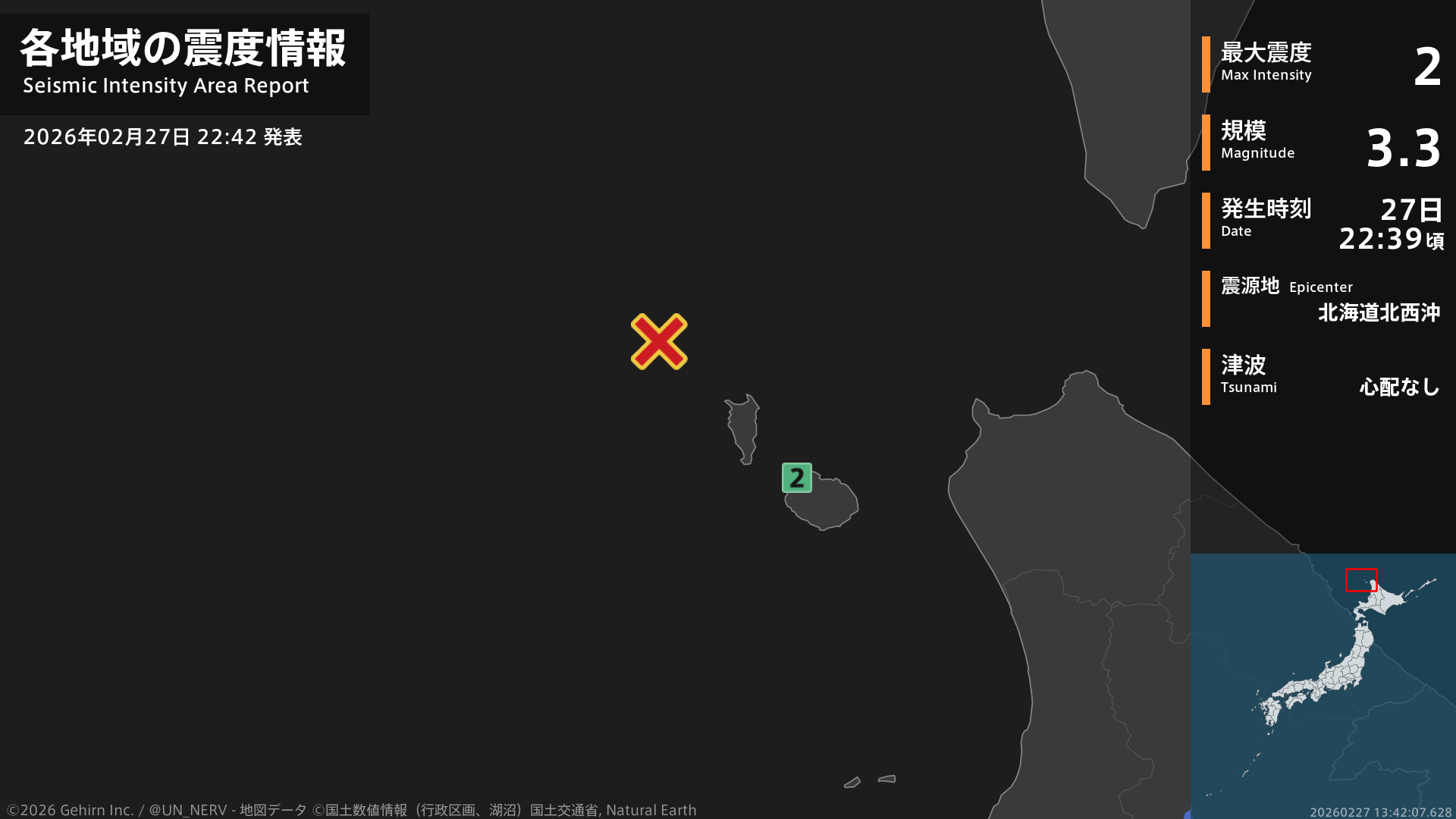 22時39分頃、北海道北西沖を震源とする地震がありました。地震の規模はM4.6程度以上、最大震度2程度以上と推定されています。この情報は気象庁の予報に基づく推定です。情報は誤差を含む場合があります。
