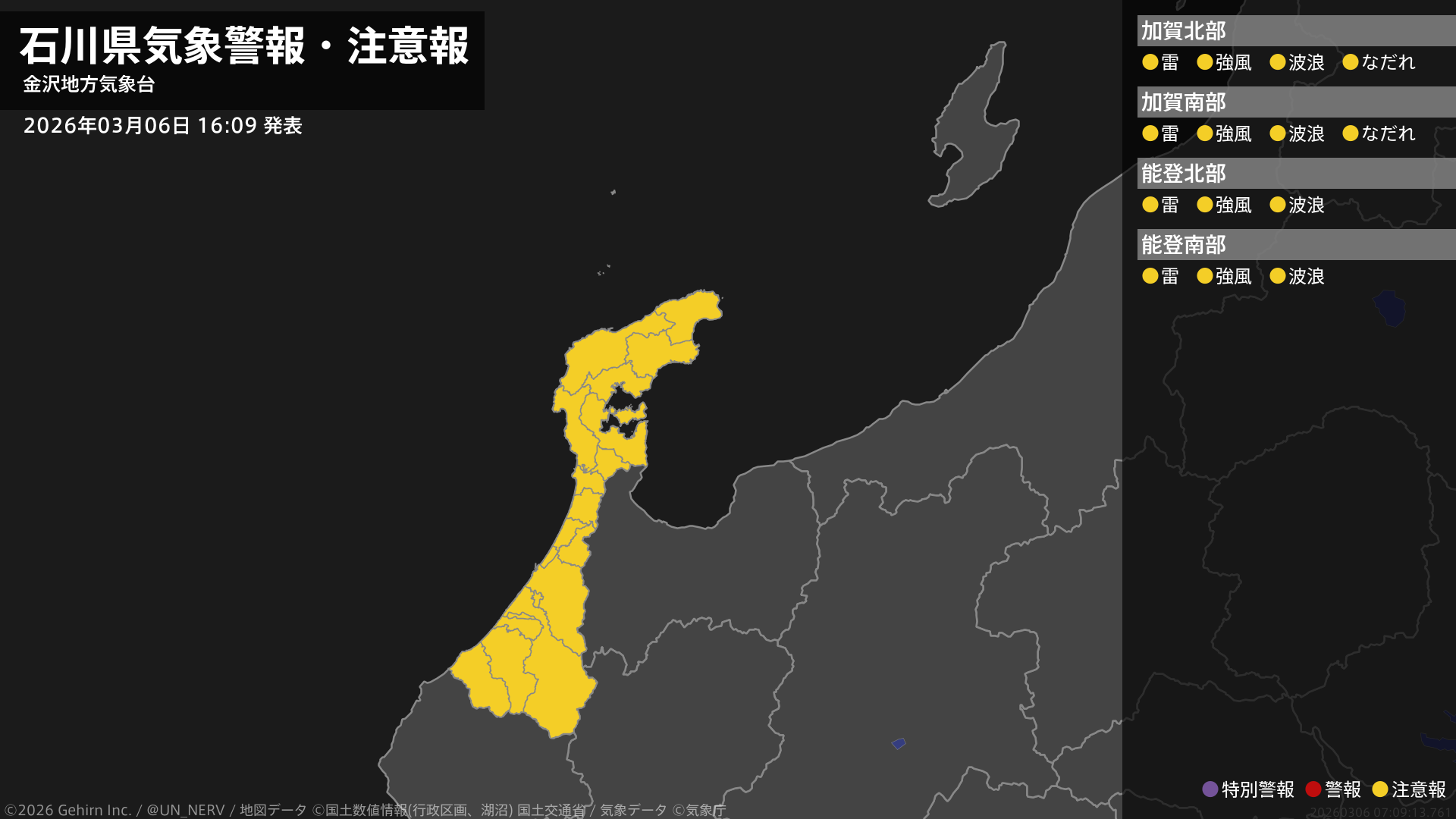 【石川県 気象警報・注意報 2026年03月06日 16:09】石川県では、6日夜のはじめ頃から7日夕方まで強風に、7日未明から高波に、6日夜のはじめ頃から急な強い雨や落雷に注意してください。加賀では、7日までなだれに注意してください。#気象警報注意報 #石川県