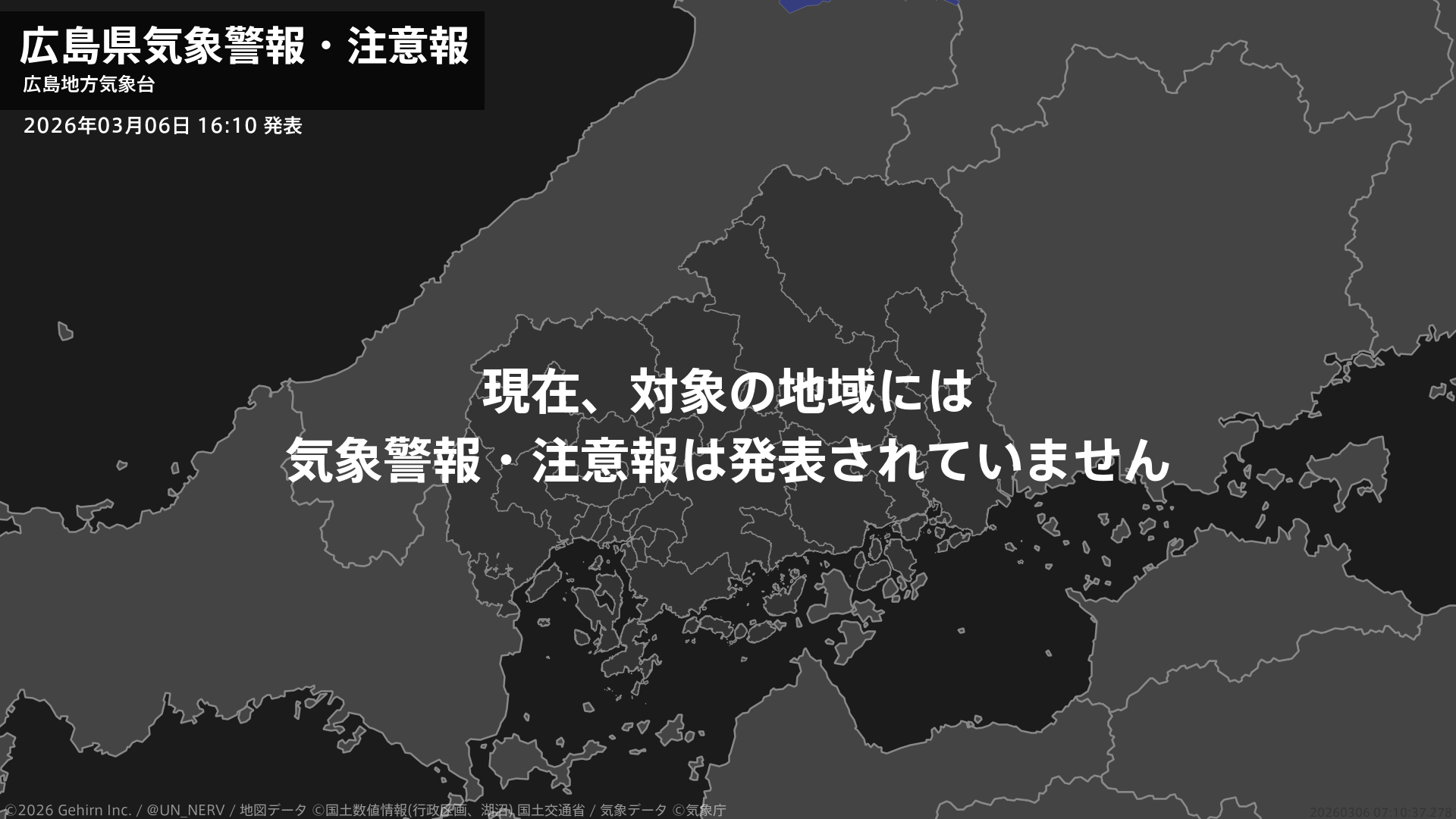 【広島県 気象警報・注意報 2026年03月06日 16:10】注意報を解除します。#気象警報注意報 #広島県