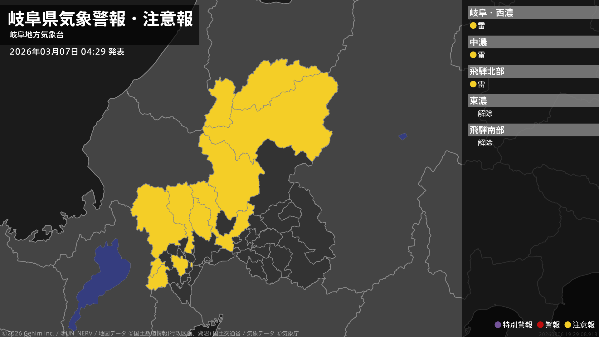 【岐阜県 気象警報・注意報 2026年03月07日 04:29】岐阜県では、7日夕方まで落雷に注意してください。#気象警報注意報 #岐阜県