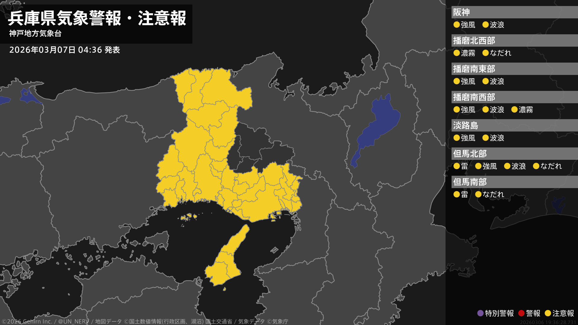 【兵庫県 気象警報・注意報 2026年03月07日 04:36】兵庫県では、強風や高波、なだれに注意してください。北部では、落雷に注意してください。南部では、濃霧による視程障害に注意してください。#気象警報注意報 #兵庫県