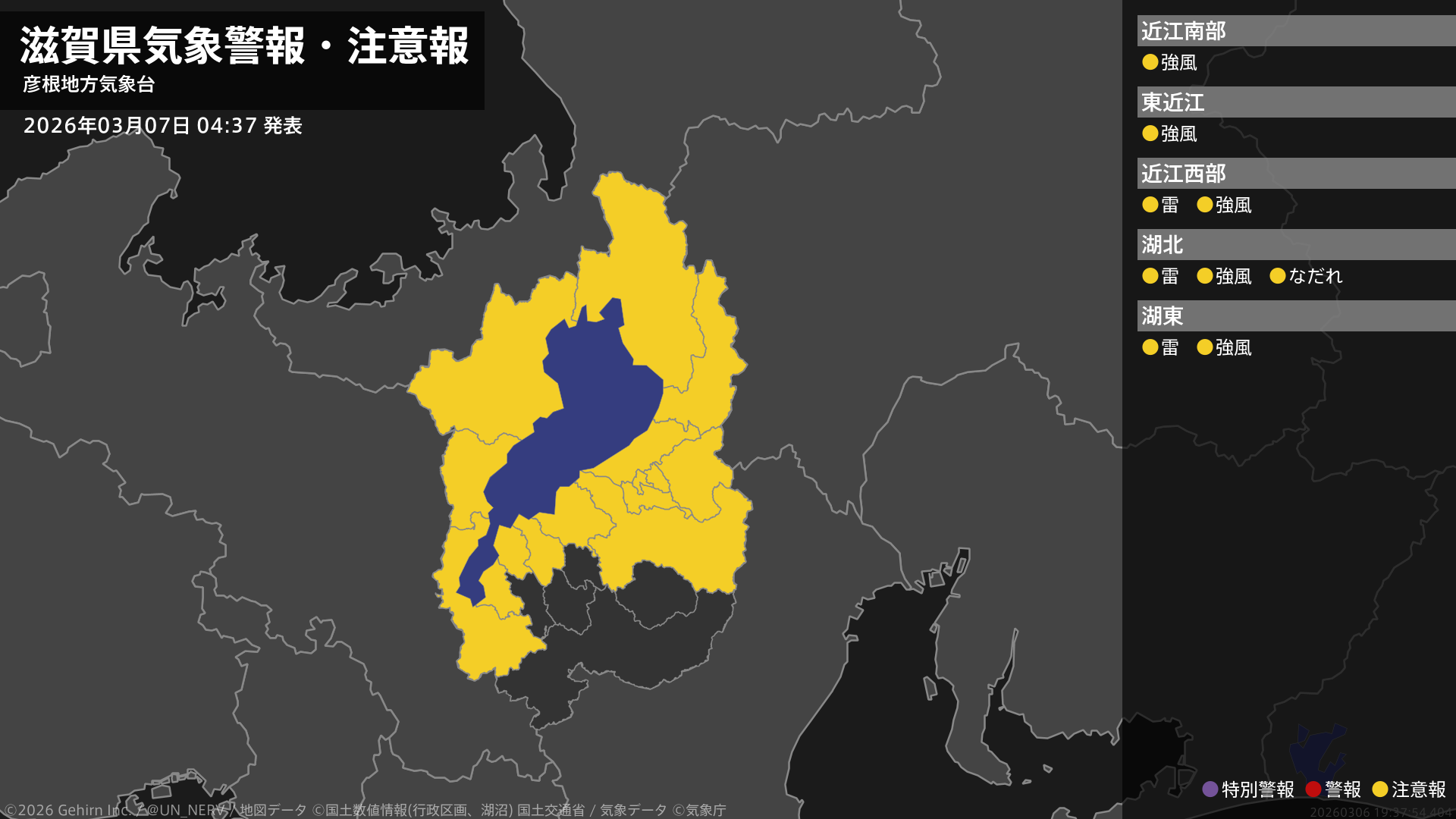 【滋賀県 気象警報・注意報 2026年03月07日 04:37】滋賀県では、強風に注意してください。北部では、落雷やなだれに注意してください。#気象警報注意報 #滋賀県