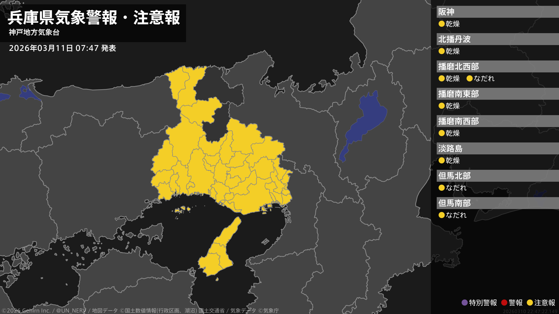 【兵庫県 気象警報・注意報 2026年03月11日 07:47】