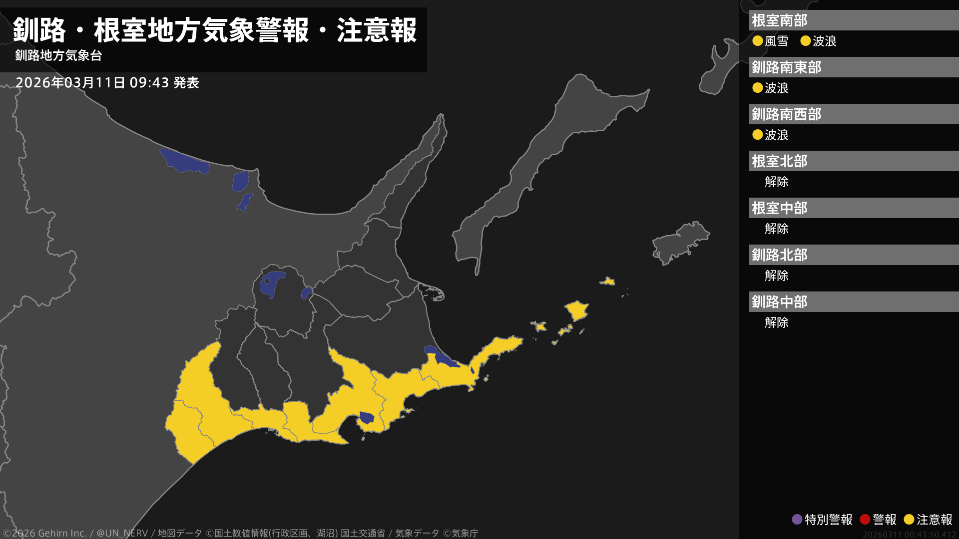 【釧路・根室地方 気象警報・注意報 2026年03月11日 09:43】